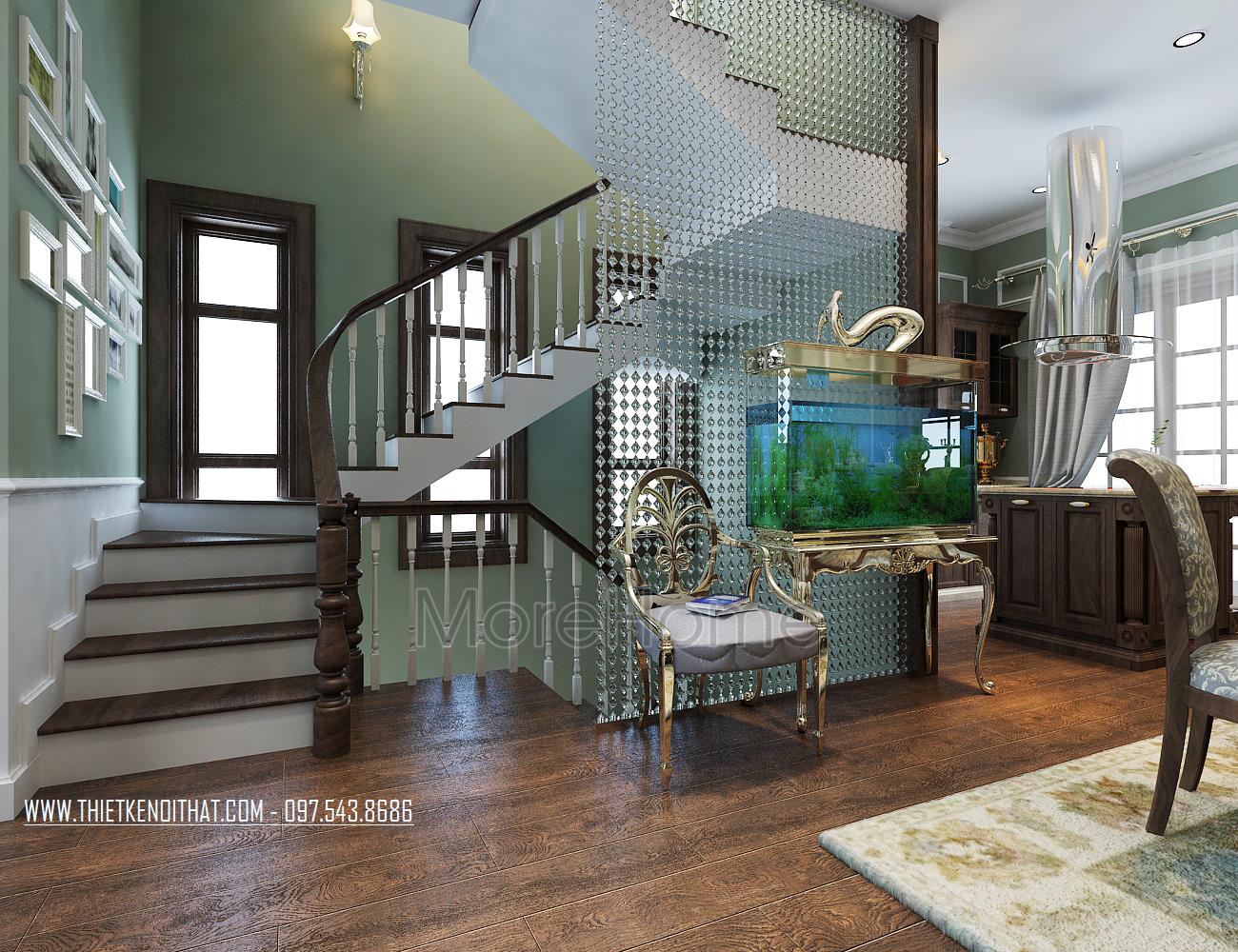 Thiết kế nội thất tân cổ điển tại phòng khách khá đơn giản. Nổi bật nhất ở không gian này chính là thiết kế ghế sofa to bành mang đến cảm giác an toàn và vững chãi cho căn nhà. Thay vì các thiết kế đơn giản, linh hoạt, không tốn diện tích thì thiết kế sofa này lại khá rộng rãi, phù hợp với các căn biệt thự cao cấp, các không gian chia cắt rõ ràng. Cửa ra vào được thiết kế cân bằng ở giữa, diện tích rộng mở và không có vật chắn giữa giúp mang lại ánh sáng tự nhiên và sự hứng khởi cho không gian.