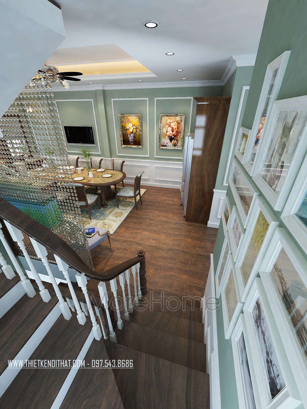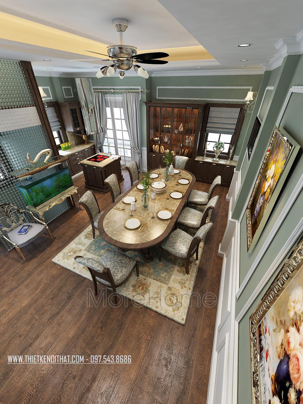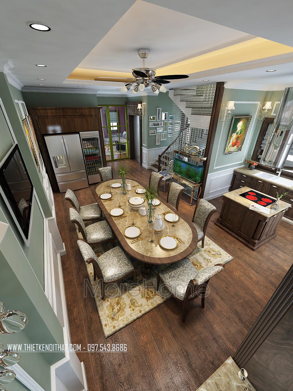 Tiếp đến là thiết kế nội thất không gian phòng bếp và bàn ăn liền kề. Thiết kế nội thất tân cổ điển nhấn mạnh vào đường nét và họa tiết trang trí cầu kỳ mang lại cho gia chủ cảm giác nhẹ nhàng và thanh thoát mang hơi hướng châu Âu cổ điển. Một trong chất liệu được kiến trúc sư ưu ái sử dụng chính là đá tự nhiên. Đây là một trong những chất liệu nhẹ được ưa chuộng những năm gần đây do tính linh hoạt và thẩm mỹ của nó. Đá tự nhiên với độ tương phản, tính mát giúp không gian trở nên tự nhiên, cân bằng sáng được đảm bảo.