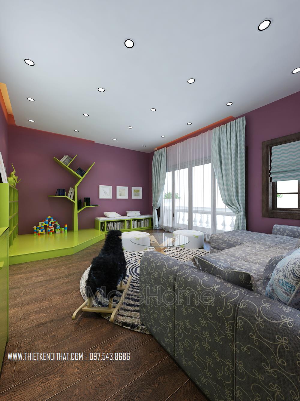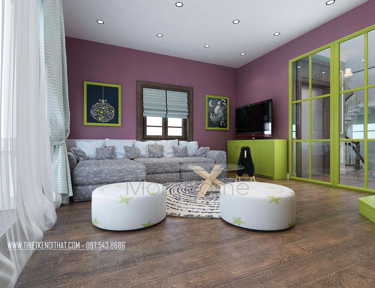 Một trong những không gian sum họp được ưa thích trong căn nhà chính là thiết kế khu sinh hoạt chung riêng biệt cho các thành viên trong gia đình. Được thiết kế riêng biệt dành riêng cho các hoạt động vui chơi, giải trí của cả gia đình, đây thực sự là nơi lý tưởng để nghỉ ngơi và thư giãn. Thiết kế sắc màu xanh, tím dường như phá vỡ quy luật tự nhiên của thiết kế tân cổ điển mà thay vào đó là sự hiện đại, năng động và trẻ trung.