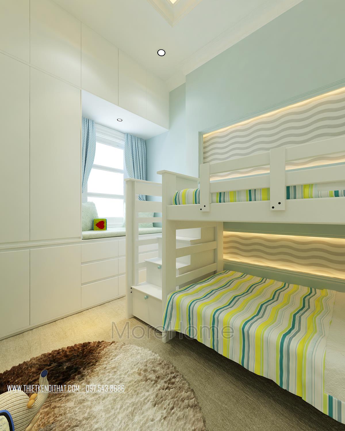 Cuối cùng là thiết kế phòng ngủ cho trẻ nhỏ với giường tầng đa năng.Thiết kế ngăn kéo đa năng kết hợp khéo léo với giường hay tủ gỗ là điểm nhấn công năng quan trọng giúp tiết kiệm diện tích căn phòng nhỏ. Thiết kế bàn học sáng tạo là điểm cộng lớn mang đến sự hào hứng cho trẻ nhỏ.