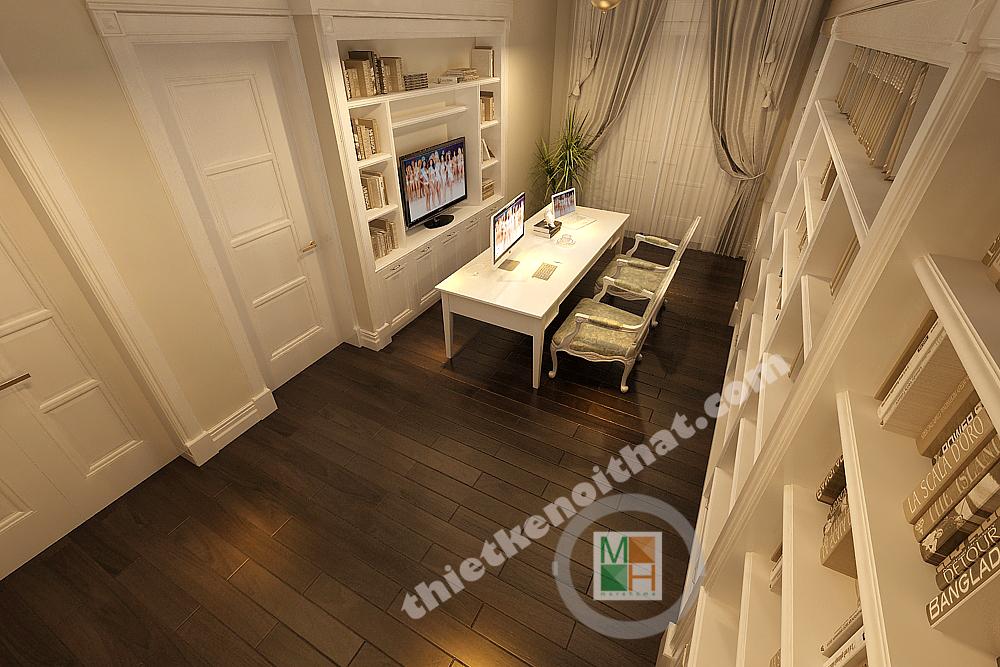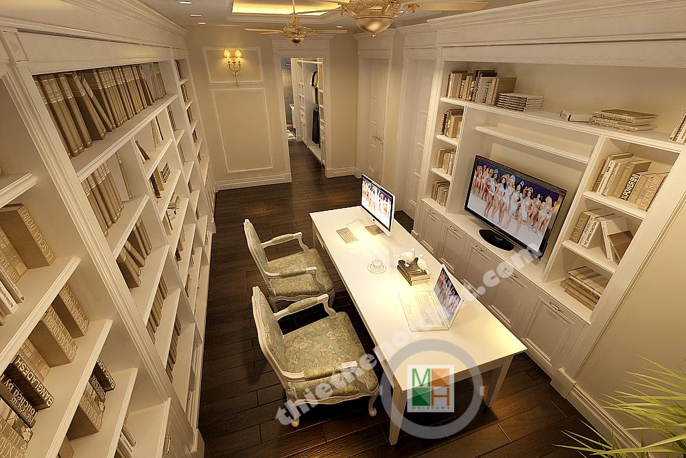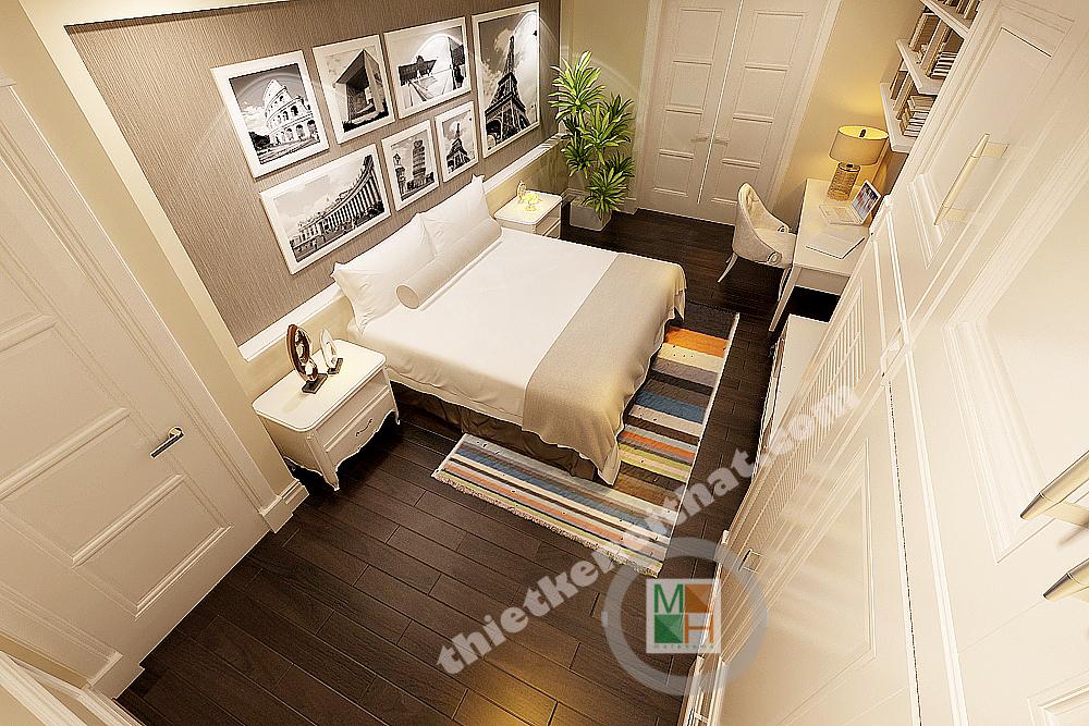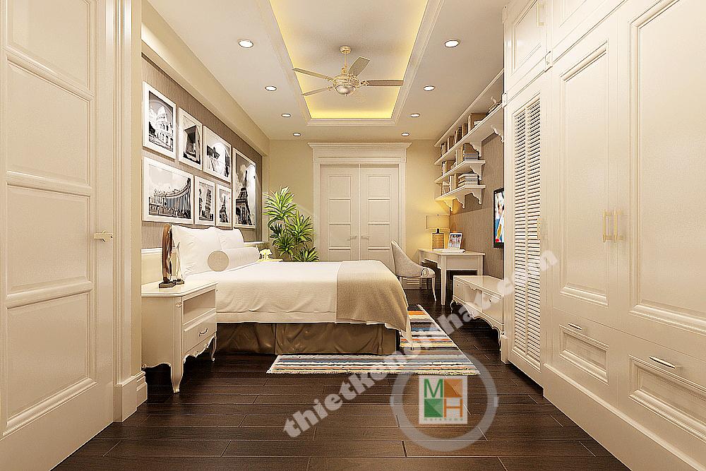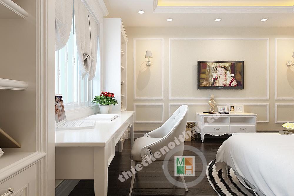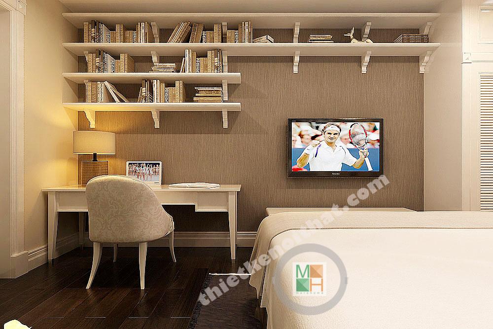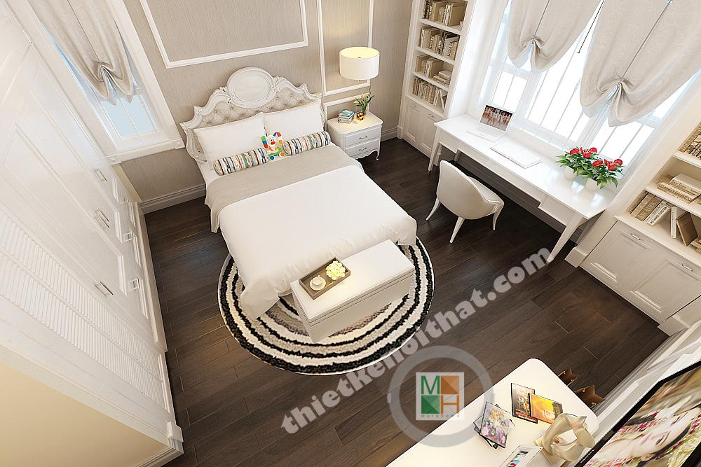 Phòng ngủ của con được thiết kế không có nhiều đồ đạc rườm rà nhưng vẫn đem đến không khí sinh động, giàu sức sống. Tủ sách được thiết kế đối xứng hai bên cửa sổ, phía dưới là bàn học, tạo thành một góc học tập gọn gàng và ấm áp. Tủ quần áo được thiết kế âm tường, để ra một phần không gian trống cho các hoạt động giải trí khác.