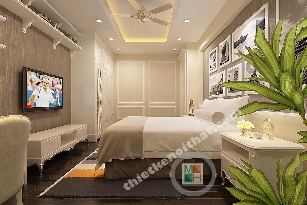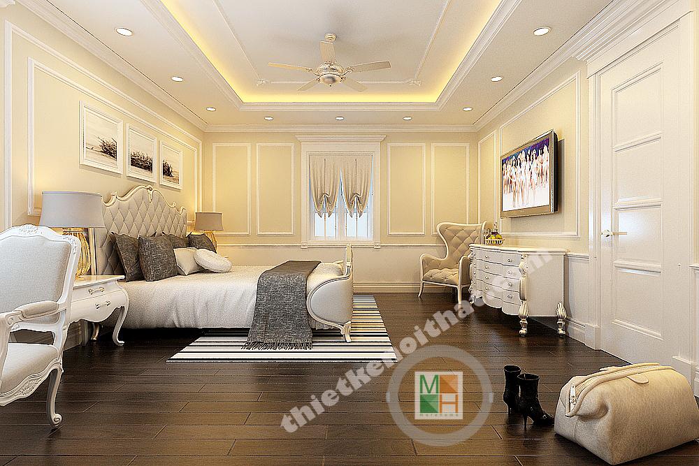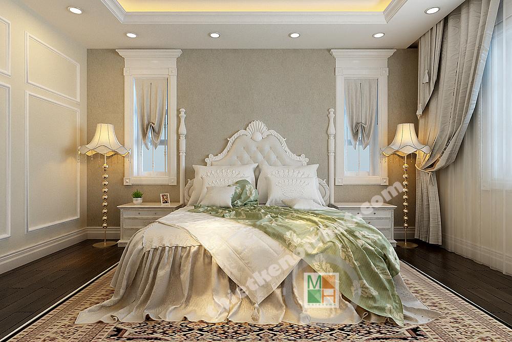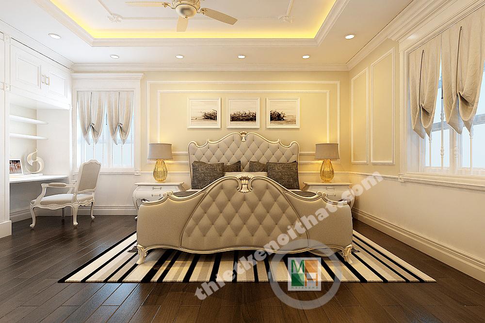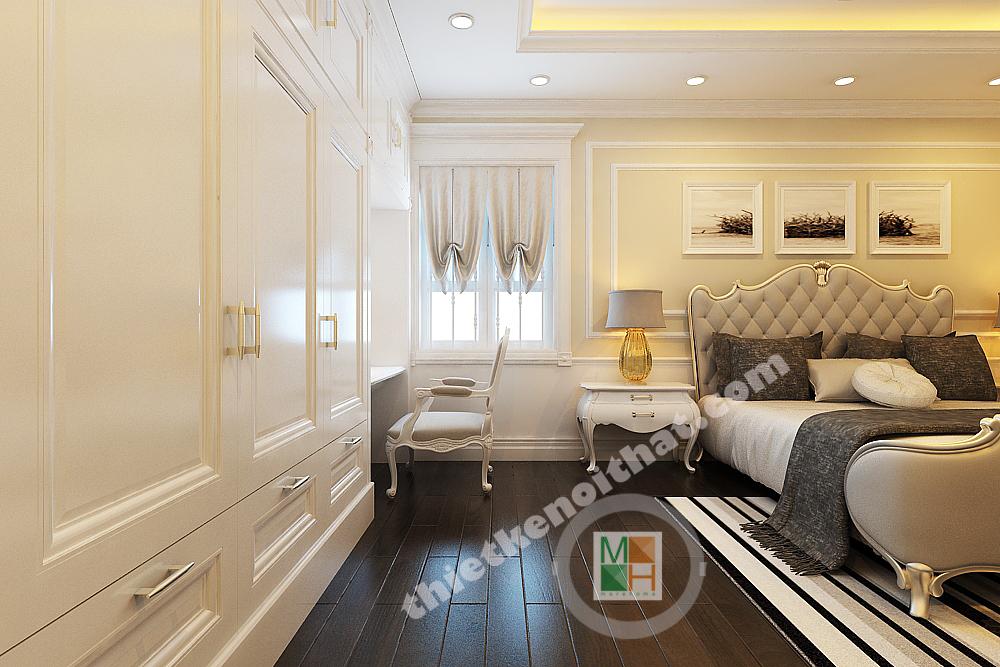 Phòng ngủ chính được trang bị giường ngủ kingsize sang trọng, thể hiện đẳng cấp của gia chủ. Những đường cong mềm mại trên đồ nội thất đem đến một không gian lãng mạn và quyến rũ. Gam màu trắng chủ đạo càng nổi bật và lung linh hơn khi những tia nắng từ hai ô cửa sổ chiếu vào phòng.