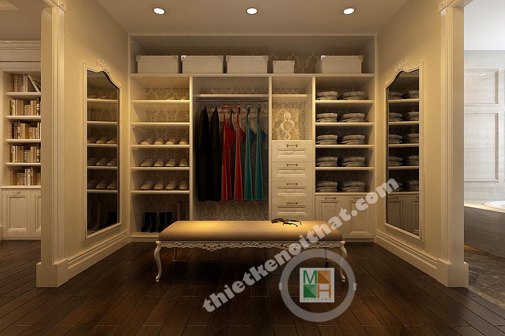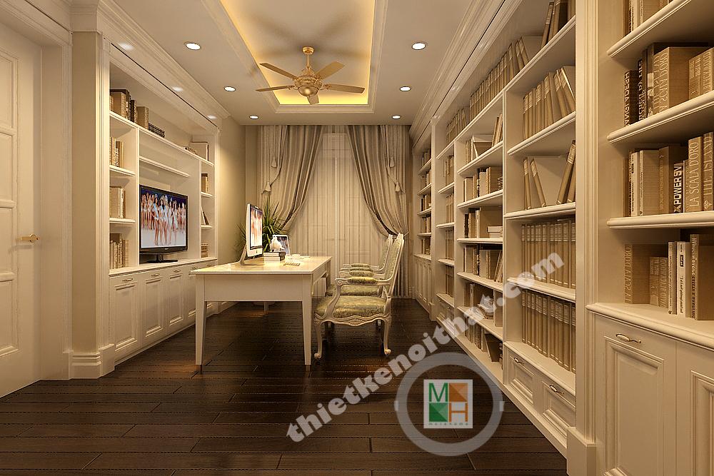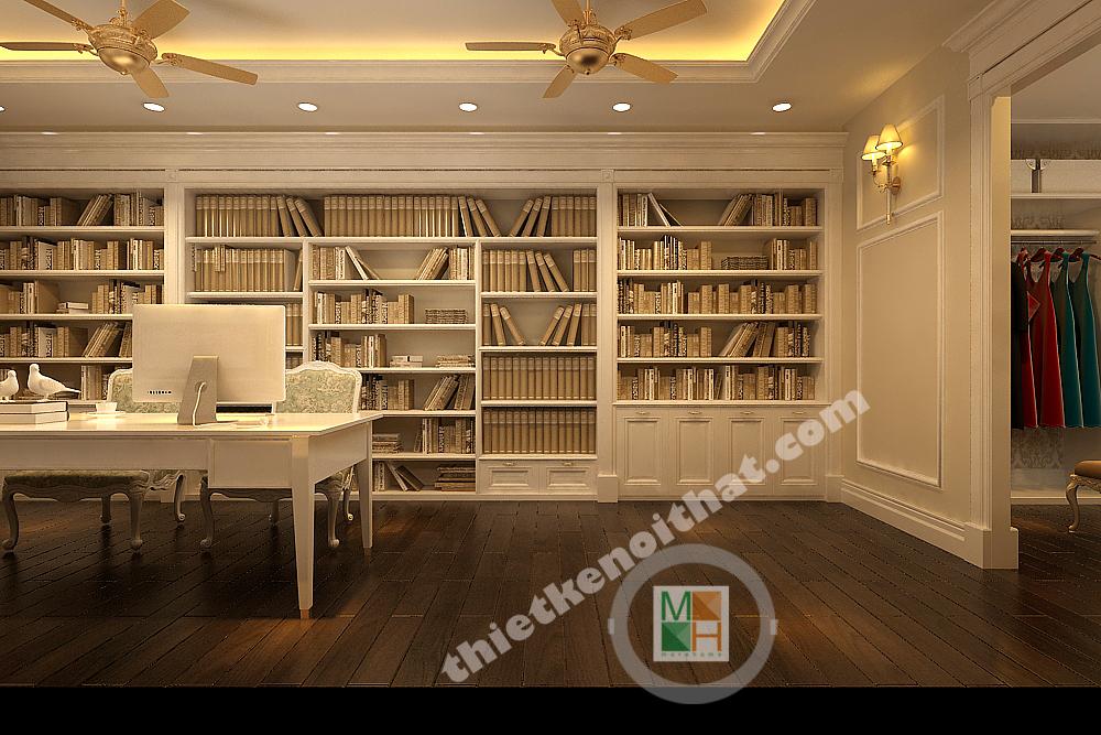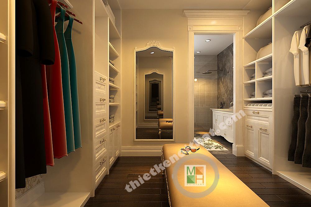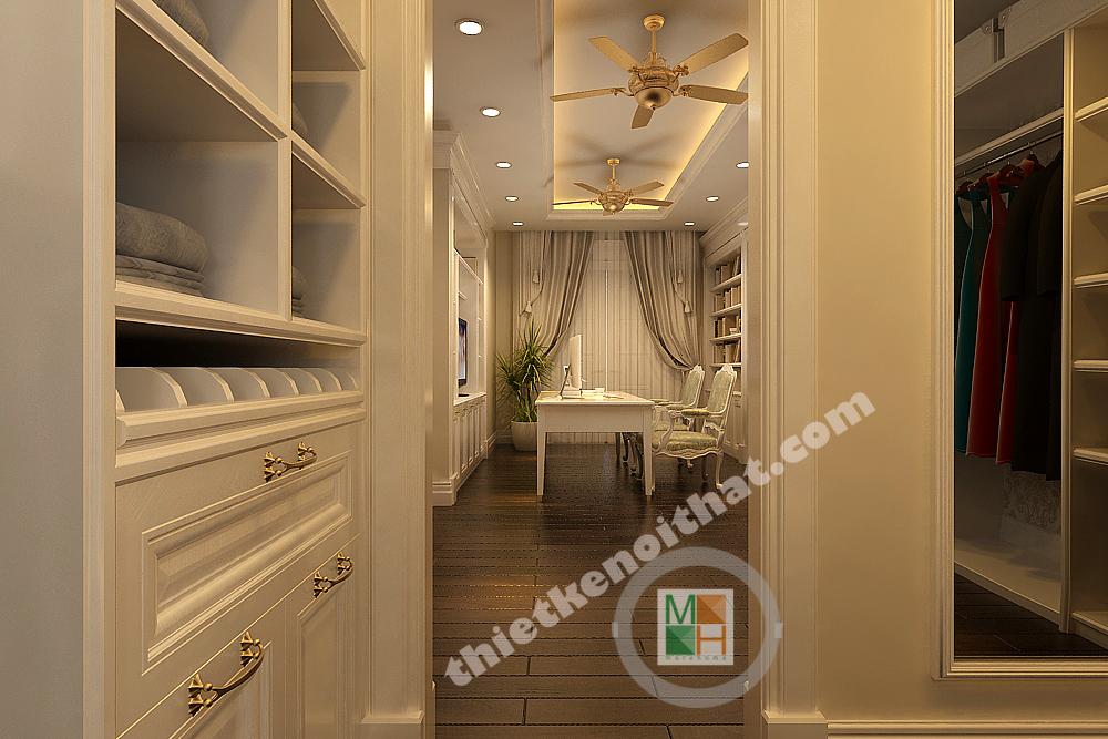 Căn phòng đặc biệt nhất của ngôi nhà là sự liên thông giữa không gian đọc sách, nơi lưu trữ quần áo và phòng tắm. Thư phòng với hệ thống giá sách kéo dài hết mảng tường, giúp gia chủ có thể dễ dàng lưu trữ và phân loại sách cho mình. Buồng cất quần áo cũng có khá nhiều kệ và ngăn tủ nên các bà nội trợ tha hồ lưu trữ phụ kiện và các món đồ thời trang khác.