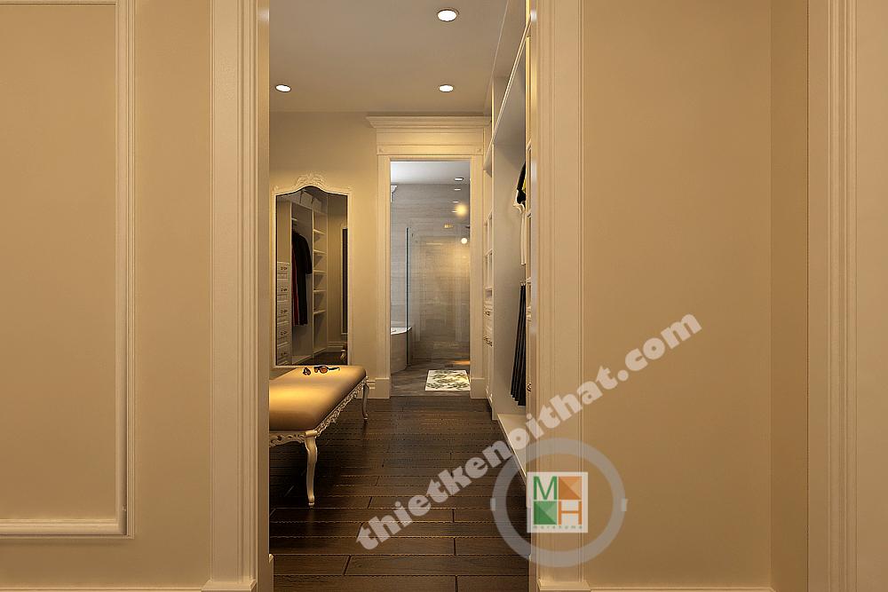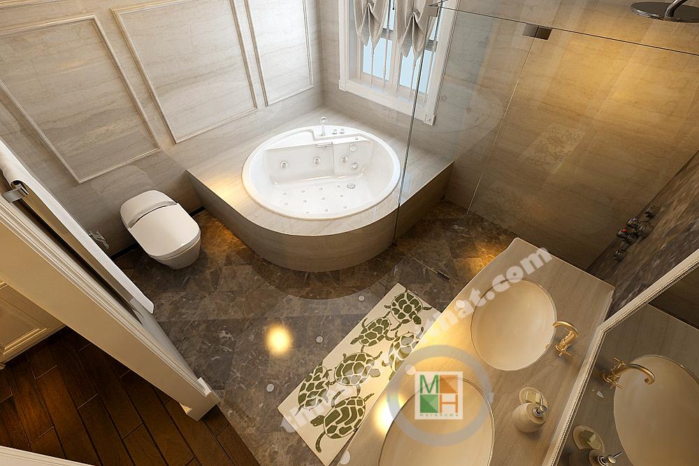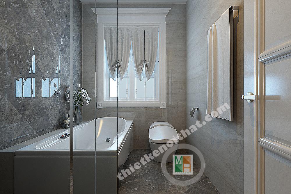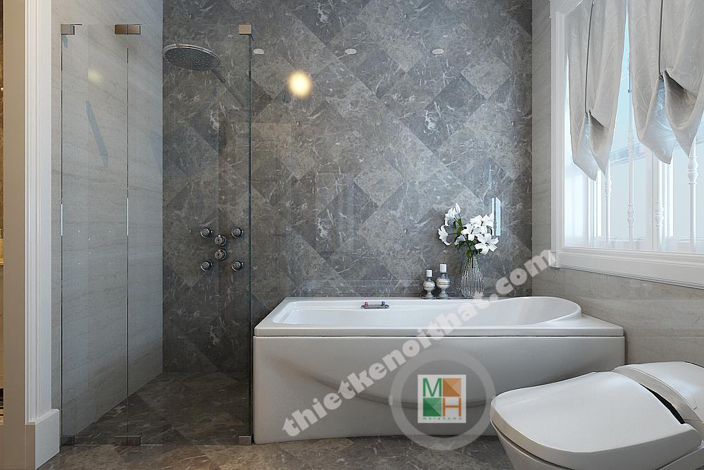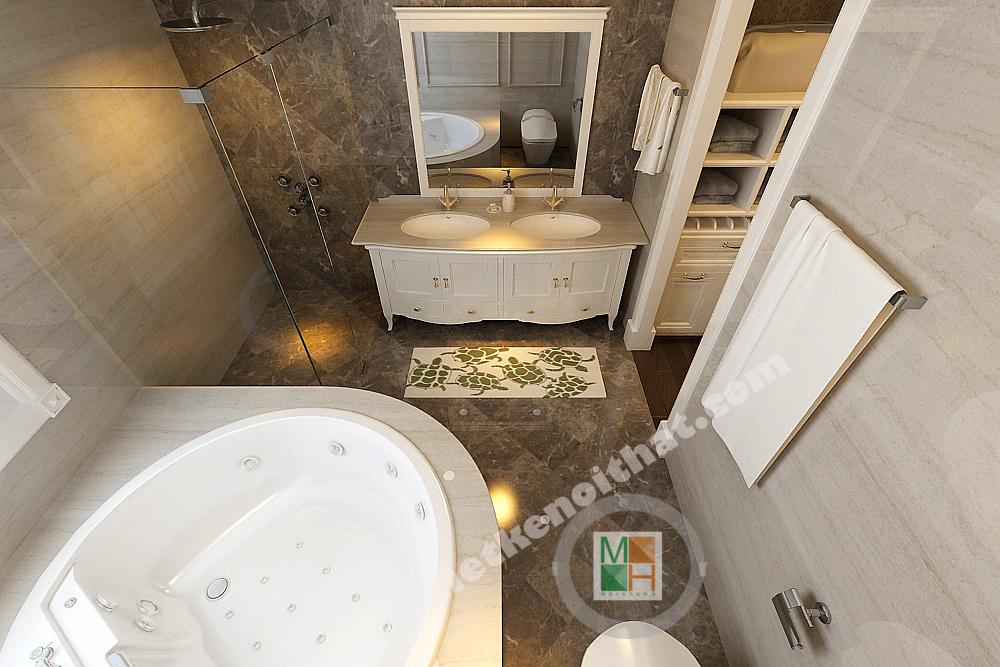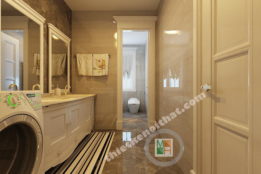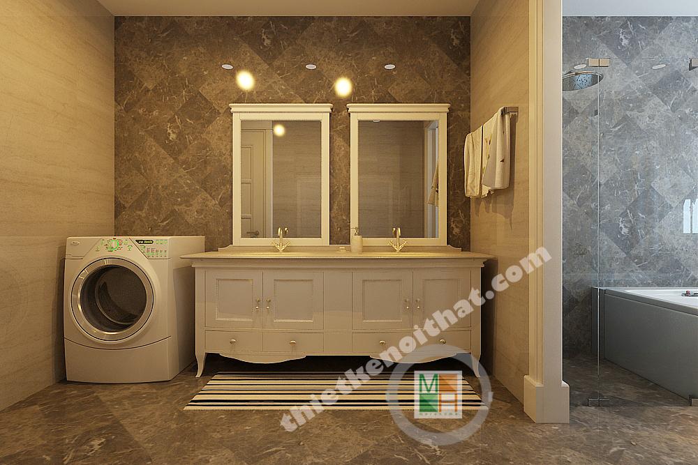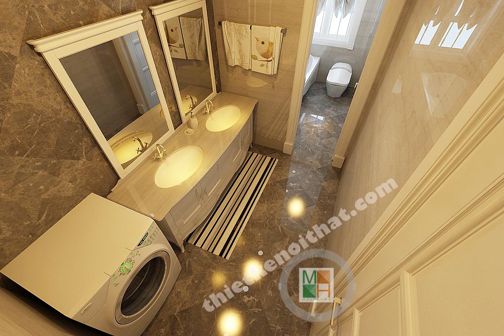 Phòng tắm của biệt thự được thiết kế sang trọng và lịch sự với loại đá ốp có độ bóng cao. Chính những món đồ nội thất sáng màu đã đem lại cảm giác sạch sẽ và hiện đại cho căn phòng. Phòng tắm của master còn có bồn rửa và gương đôi để vợ chồng gia chủ có thể nhanh chóng vệ sinh trước khi đi làm vào buổi sáng.