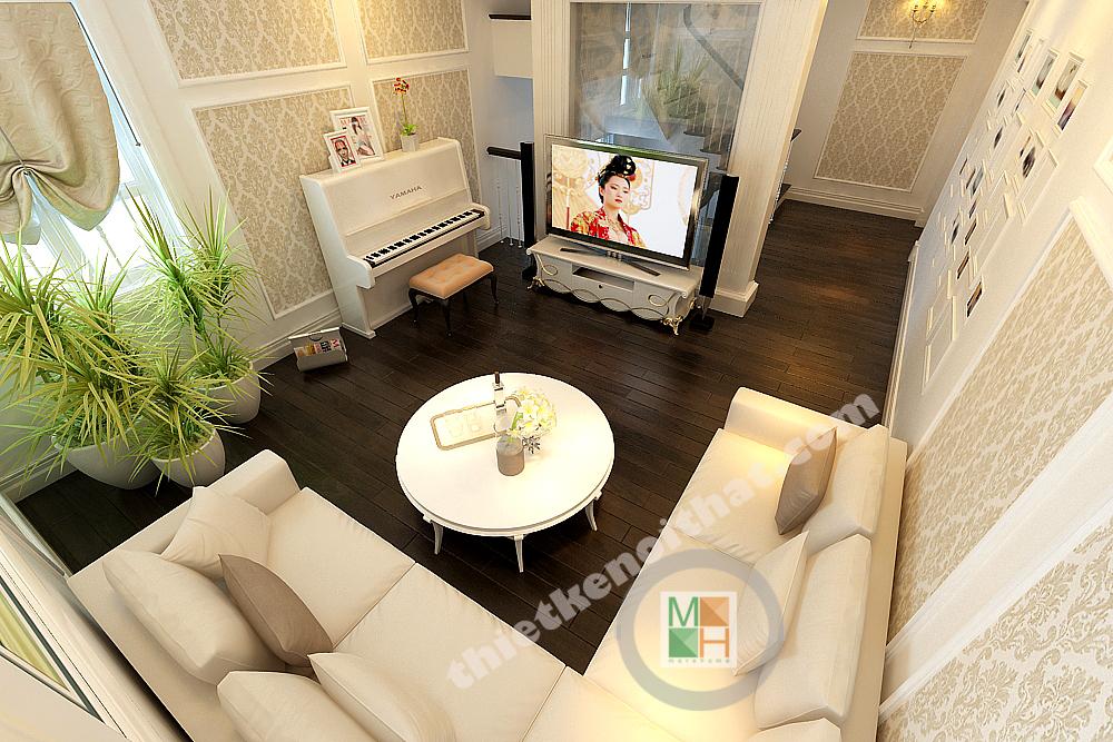 Phòng khách được trang bị bộ sofa bằng vải nỉ sang trọng, bên cạnh là hai bức tượng điêu khắc ấn tượng, tạo cảm giác như đang ngồi trong một cung điện ở Châu Âu. Bàn trà có kích thước trung bình, ngoài việc tiếp khách có thể coi như một món đồ trang trí lịch thiệp trong giới quý tộc. Đối diện nơi tiếp khách là mảng tường trống nên các kiến trúc sư đã thiết kế nó dưới dạng cổng vòm, đặc trưng trong kiến trúc của các công trình châu Âu. Có thể trang trí thêm trên tường bằng một bức tranh phục hưng, thể hiện tâm hồn nghệ thuật của gia chủ.