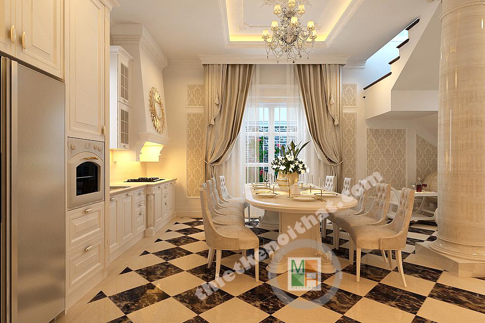 Khu vực bếp được trang trí bởi những họa tiết mang phong cách hoàng gia tinh tế và đẹp mắt. Hệ tủ bếp liên hoàn với hệ tủ đa năng âm tường khiến cho căn bếp trông gọn gàng và hiện đại.