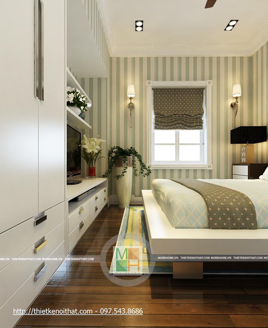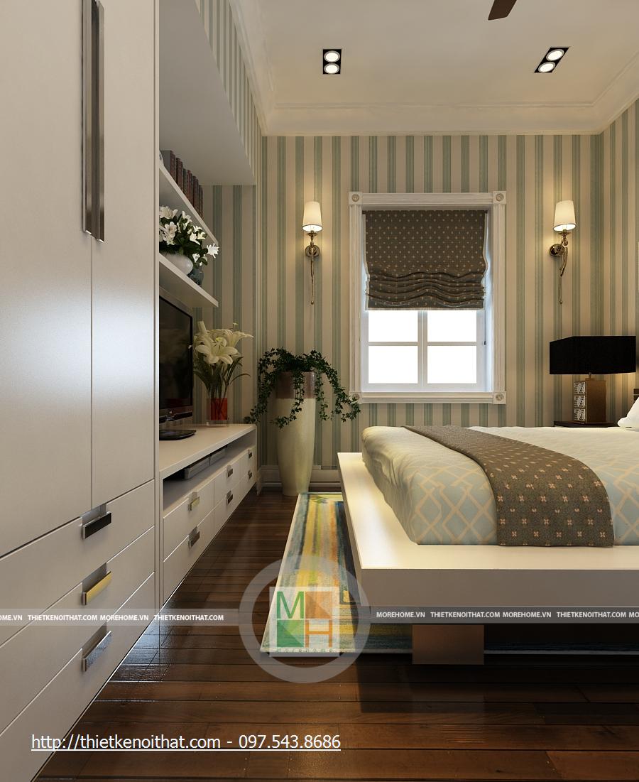 Phòng ngủ bố mẹ rất rộng với những thiết kế nội thất sang trọng. Giường lớn được đặt ở giữa phòng với màu ga màu sáng, nổi bật trên đó là chăn gối màu nâu. Cạnh giường là 2 cửa sổ lớn, tạo một không gian ánh sáng rất đẹp. Hai chiếc kệ nhỏ được kê sát cửa sổ để đặt đèn ngủ. Tường được trang trí màu vàng nhẹ, kết hợp với đèn tường và đèn hắt trần cùng màu, tạo sự ấm cúng cho căn phòng. Phòng có 2 cửa sổ phụ, giúp có thêm ánh sáng tự nhiên, cạnh đó là bộ bàn ghế uống nước nhỏ. Tủ đồ lớn được đặt sát tường cạnh cửa ra vào, chiếm gần hết diện tích căn phòng. Đối diện giường là kệ đặt TV và cũng là một cái tủ nhỏ đựng các vật dụng đơn giản. Đối xứng hai bên là 2 chiếc kệ cao để đặt bình hoa, giúp căn phòng thêm tươi mới