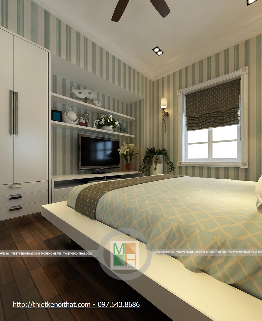 Phòng ngủ con tầng 3 được trang trí khá rực rỡ và trẻ trung. Có một chút giống nhau về nội thất với phòng ngủ của con ở tầng 2. Vẫn là 2 cửa sổ nhỏ cạnh giường, cửa sổ chính lớn và bàn làm việc cạnh đó, màn hình TV được đặt trên kệ đối diện giường. Tuy nhiên một chút màu sắc được đưa vào bộ chăn-ga –gối đã khiến cho căn phòng trẻ nên sinh động và đầy màu sắc. thay vì màu sẫm như phòng ngủ cho con ở tầng 2, chăn ga ở đây được sử dụng những sọc màu vàng kết hợp xanh lơ, tạo nên sự trẻ trung, sáng tạo cho căn phòng. Trền nền vàng ấm nhẹ của căn phòng là những khung tranh nhỏ, giúp cho nên tường không bị nhàm chán và hơn nữa là tăng thêm sự mới mẻ cho căn phòng. Căn phòng được thiết kế dành cho con gái.