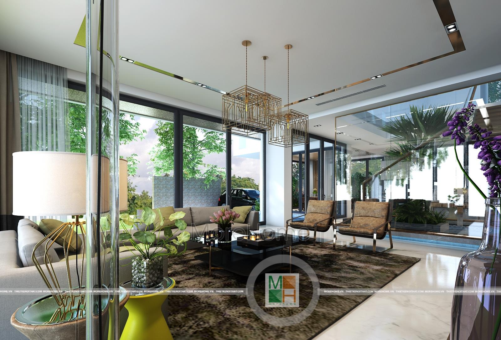 Khoảng sàn ngoài hiên được làm từ gỗ khối tự nhiên cao cấp. khối gỗ dày tạo cảm giác vô cùng chắc chắn. Từ bậc thềm tam cấp đưa bạn vào không gian phòng khách hiện đại dưới tầng 1, bộ sofa chữ L được kê sát vách kính góc còn lại là 2 chiếc ghế thư giàn bọc da. Đèn trang trí được thiết kế theo cấu trúc đèn lồng khá độc đáo mang trên mình phong cách truyền thống nhưng lại được nhấn nhá với màu sắc của phong cách hiện đại cùng tông màu với ghế thư giãn. Tất cả được bố trí hài hòa tạo nên một tổng thể hoàn thiện.