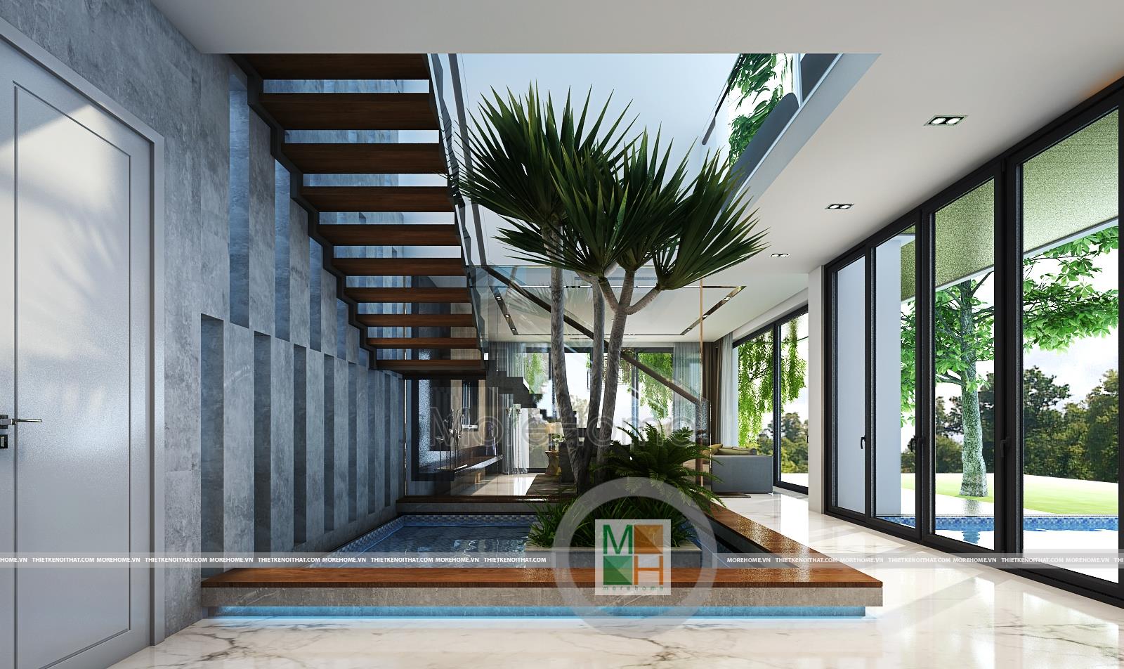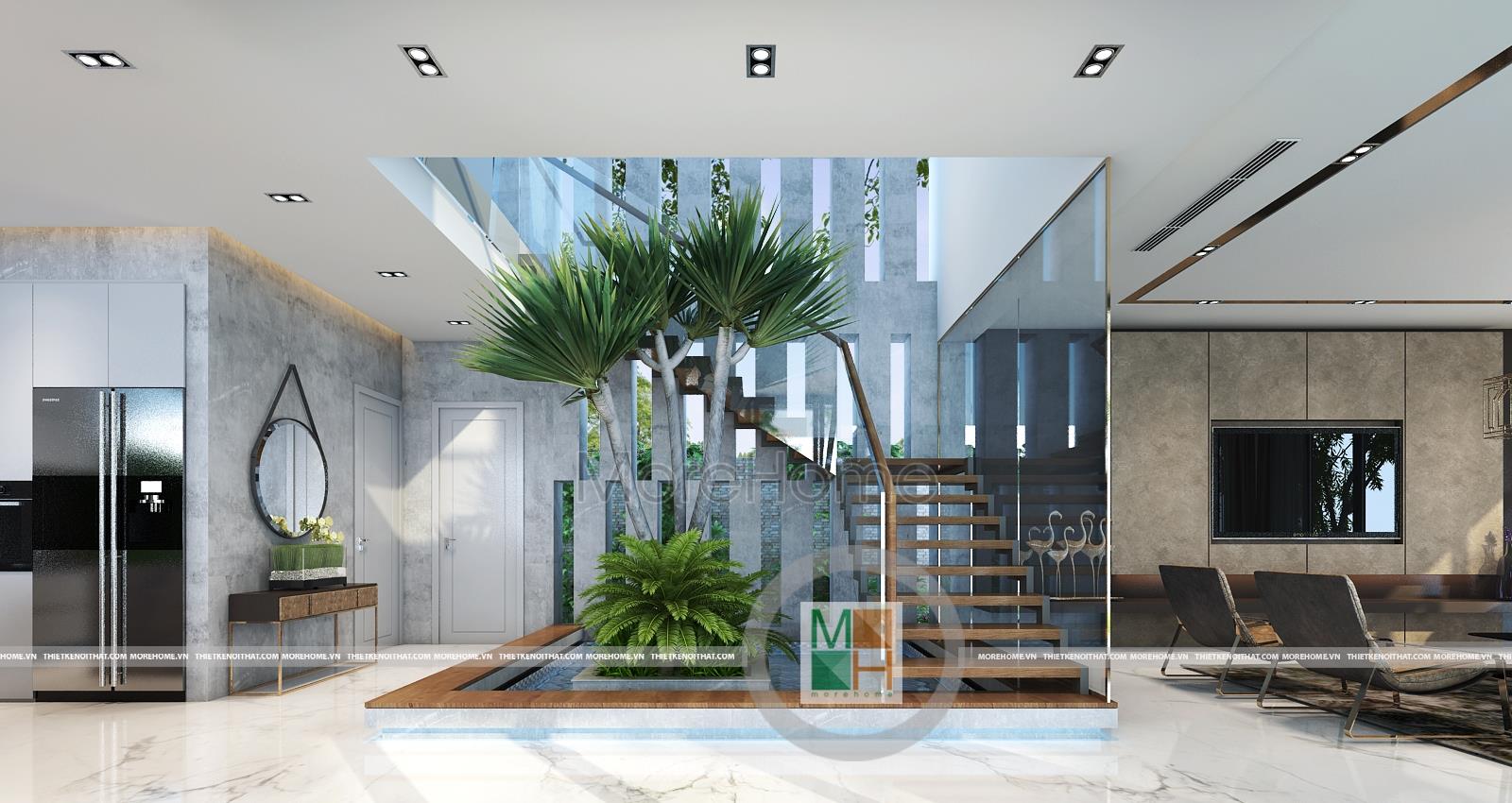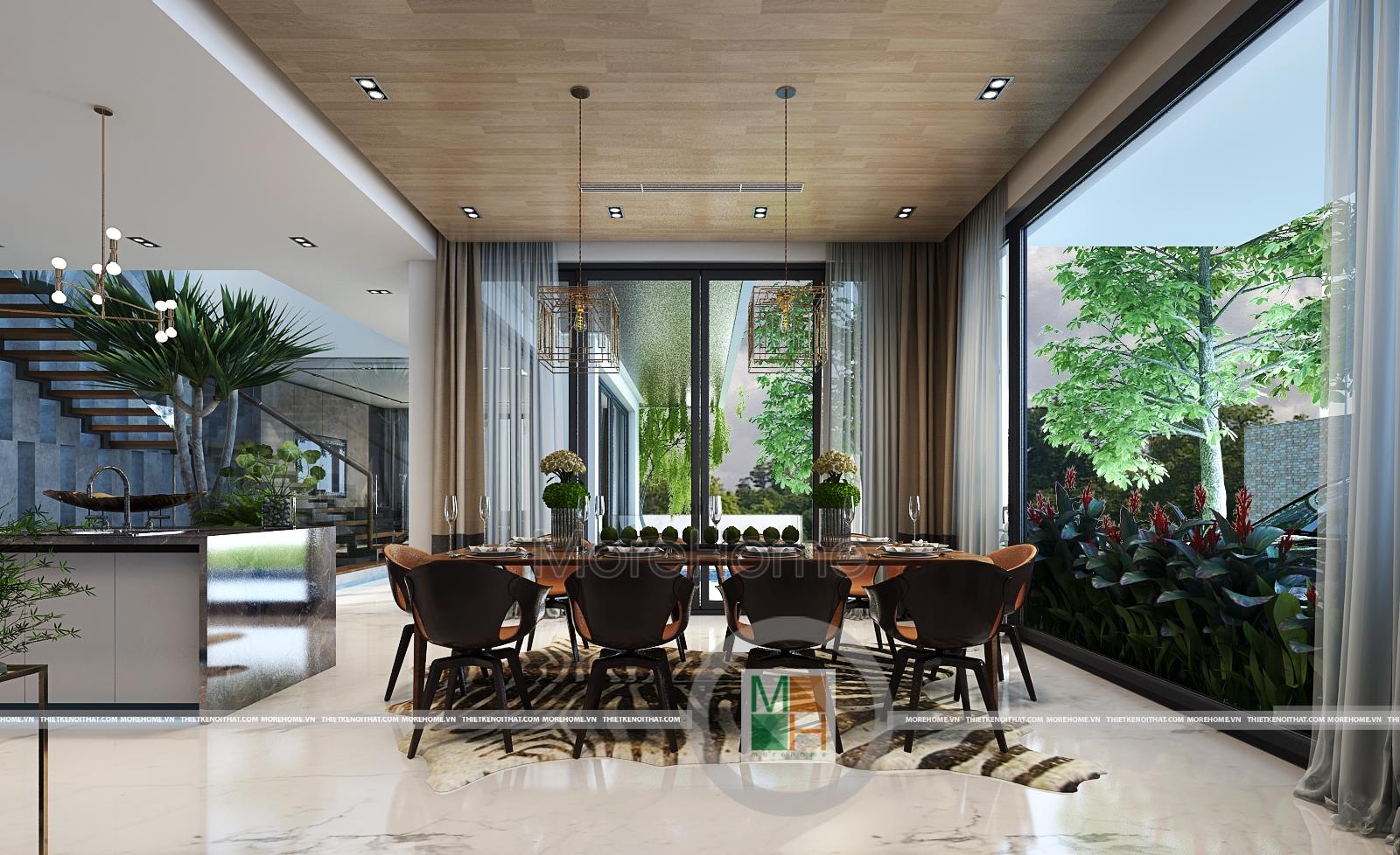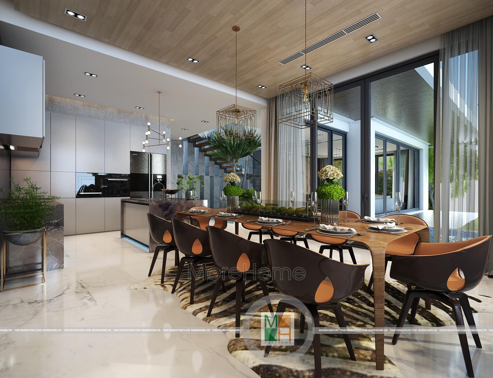 Phân tách giữa phòng khách với các không gian khác là vách kính cường lực trong suốt nhưng vẫn có được sự liền mạch. Sau vách kính là cầu thang lên tầng 2. Với không gian rộng nên dưới chân cầu thang còn được bố trí thêm tiểu cảnh với cây xanh và một bồn nước nhỏ điều hòa không khí cho phòng ăn và phòng bếp bên cạnh. Phòng ăn và phòng bếp được thiết kế trong cùng một không gian nội thất. Các kiến trúc sư đã khéo léo sắp đặt thành một không gian riêng biệt tạo thành góc L với cấu trúc chung của căn biệt thự. Bàn ăn lớn dành cho 10 người rất phù hợp với những buổi tiệc tùng liên hoan hay những bữa cơm sum họp gia đình ấm cúng. Phòng ăn với 3 vách kính thông thoáng nên có thể tận dụng tối đa được ánh sáng tự nhiên và không dùng nhiều tới hệ thống chiếu sáng chung trong nhà. Điểm khác biệt của không gian này là không sử dụng trần thạch cao mà sử dụng trần gỗ tạo điểm nhấn rất riêng.