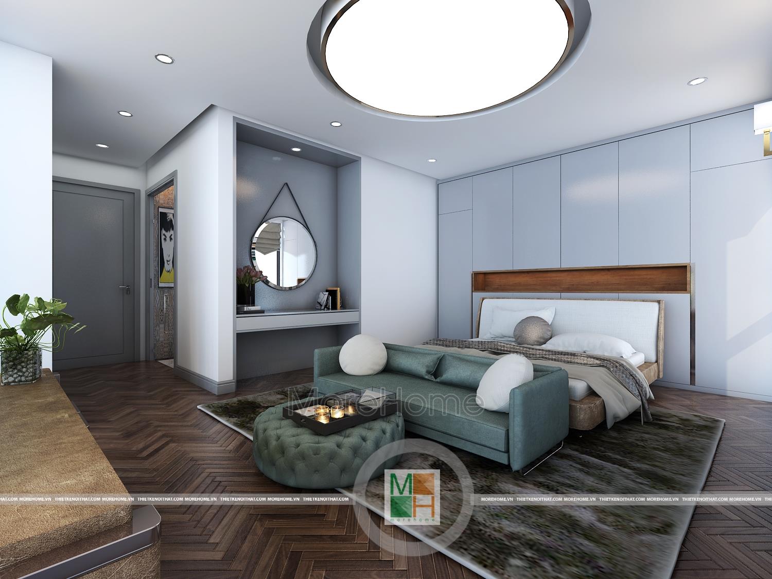 Căn phòng đầu tiên nhiều tiện nghi nhất với thiết kế độc đáo. Diện tích căn phòng khá rộng nên kiến trúc sư có tư vấn kê thêm một bộ sofa đơn giản màu ngọc lam đậm. Bạn cũng có thể dùng căn phòng này để tiếp khách trong trường hợp khẩn cấp. Hệ thống tủ đồ và tủ trang trí đa số được thiết kế âm tường nên căn phòng có được độ phẳng nhất định. Trong căn phòng ngủ này còn sử dụng đèn mâm âm trần lớn thay thế cho tất cả những thiết bị chiếu sáng thông thường khác.