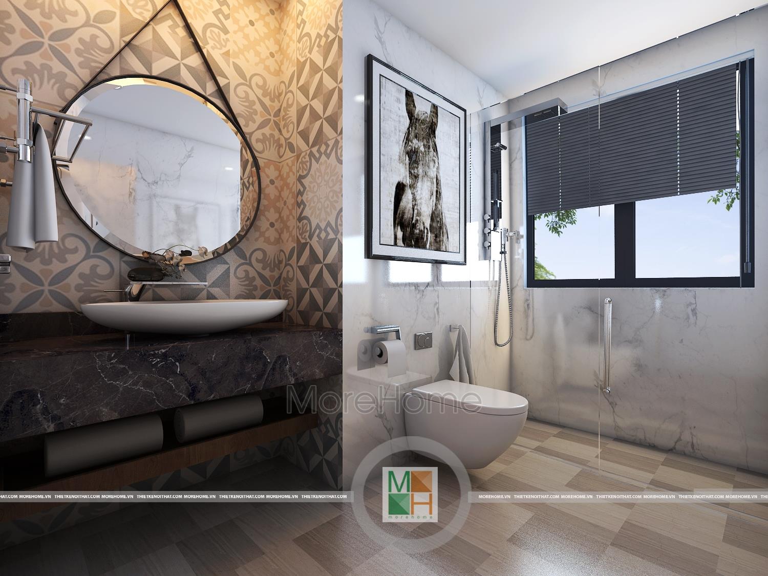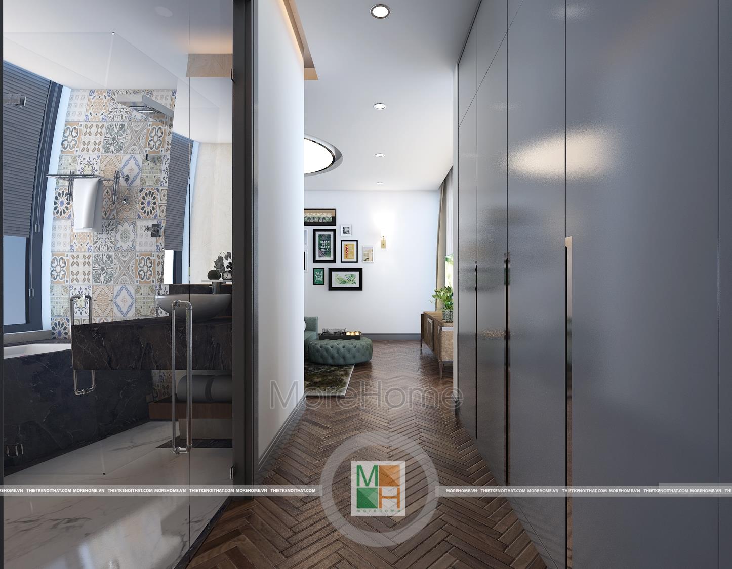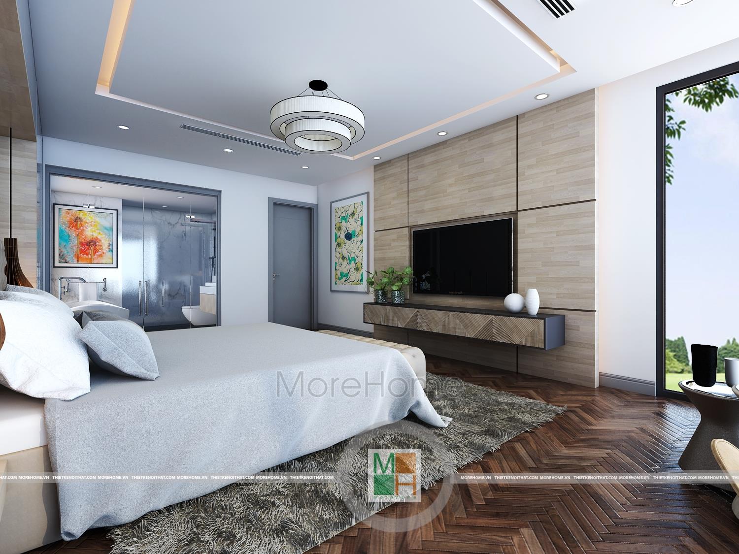 Kết thúc không gian tầng 1 tại đây chúng ta cùng tham khảo thiết kế nội thất tầng 2. Thiết kế cho tầng 2 chủ yếu là các phòng ngủ với 3 phòng riêng biệt khép kín với phòng vệ sinh riêng. Không giống như tầng 1 sàn được lát đá bóng sang trọng thì tầng 2 lại sử dụng ván sàn gỗ tự nhiên ấm cúng, ván sàn được lắp đặt theo hình xương cá đảo chiều cấu trúc rất riêng biệt và độc đáo.