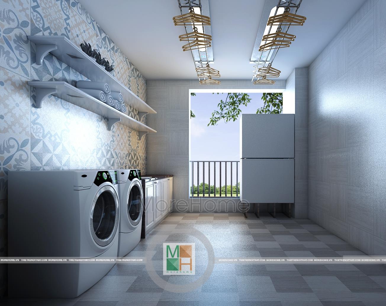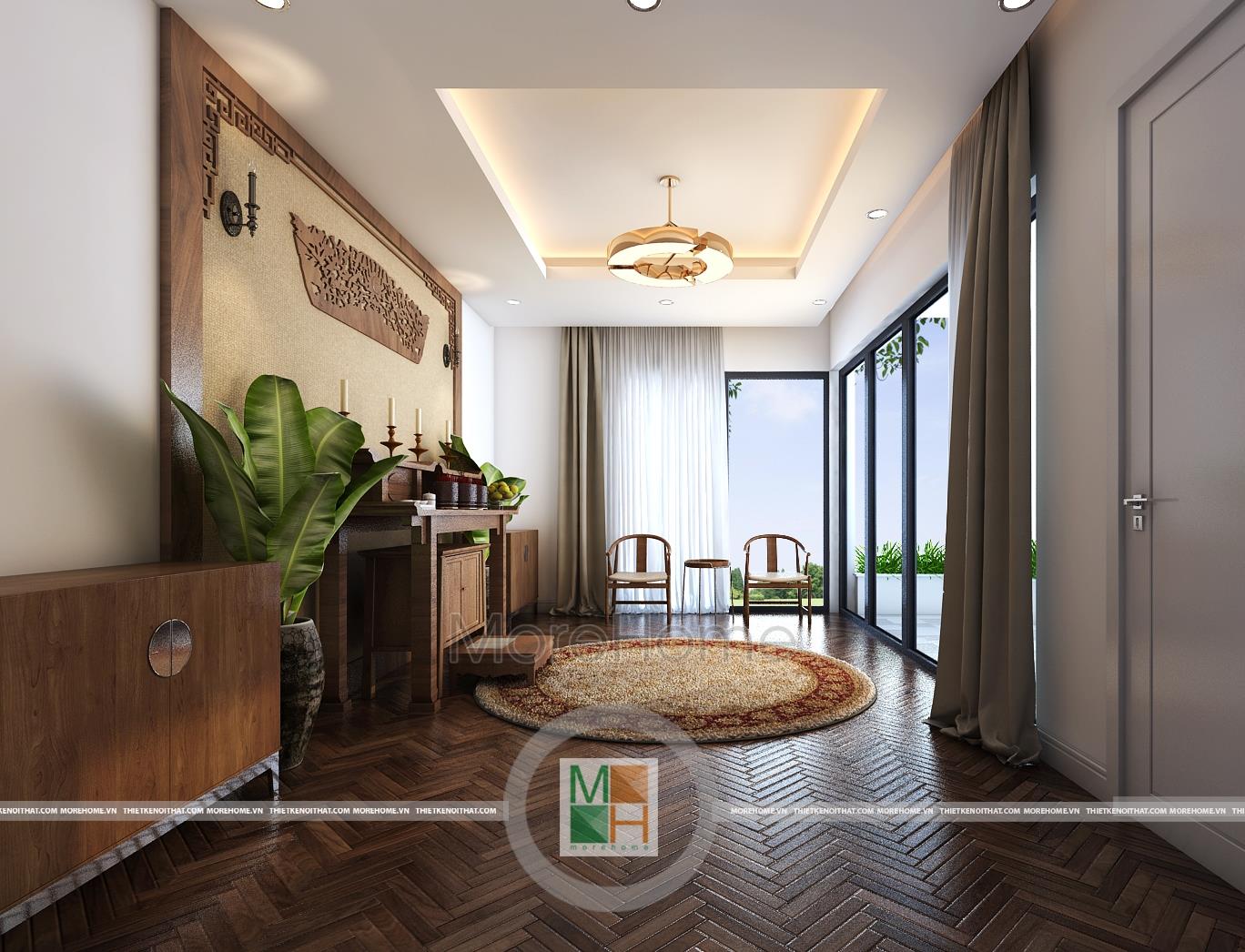 Trên tầng 3 là khu vực tâm linh có phòng thờ riêng khá quy mô với bàn sập thấp, tủ thờ và kệ bàn thờ. Bên ngoài phòng thờ có ban công thoáng.
