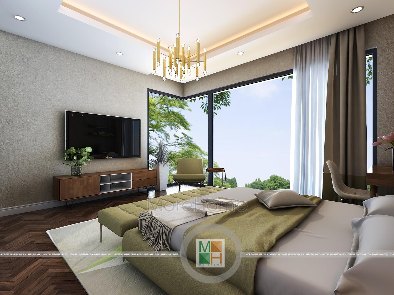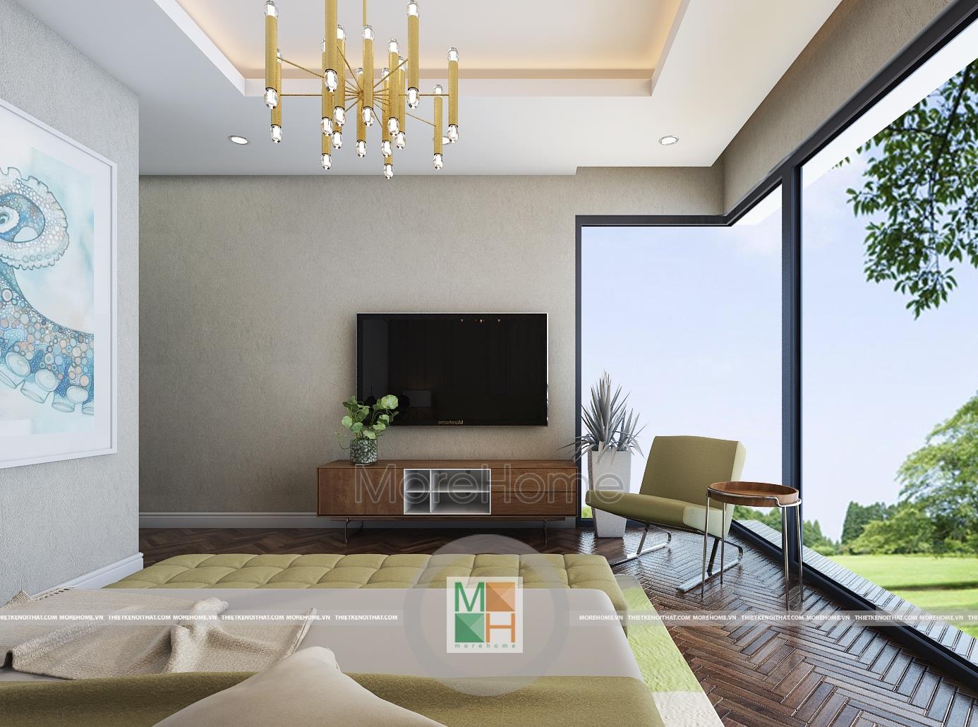 Tiếp đến là phòng ngủ số 2 được thiết kế theo phong cách hiện đại Tây Âu, với sự phóng khoáng về không gian và ý tưởng nhưng lại ấm áp trong nghệ thuật sắp đặt và phối cảnh mang lại cho bạn một không gian nghỉ ngơi thư giãn tuyệt vời. Phòng tắm được thiết kế song song với giường ngủ hướng ra ngoài cửa kính lớn. Tại đây view rất đẹp với bộ bàn trà thư giãn hình chóp úp vào nhau rất độc đáo, hệ thống tủ cũng được thiết kế âm tường, táp đầu giường lùi vào sâu trong tường một chút nhưng vẫn đảm bảo sự hài hòa và cân đối. Trên đầu giường có treo đèn chùm với ánh sáng vàng ấm áp. Không giãn lãng mạn và hiện đại này rất phù hợp cho những cặp vợ chồng mới cưới.