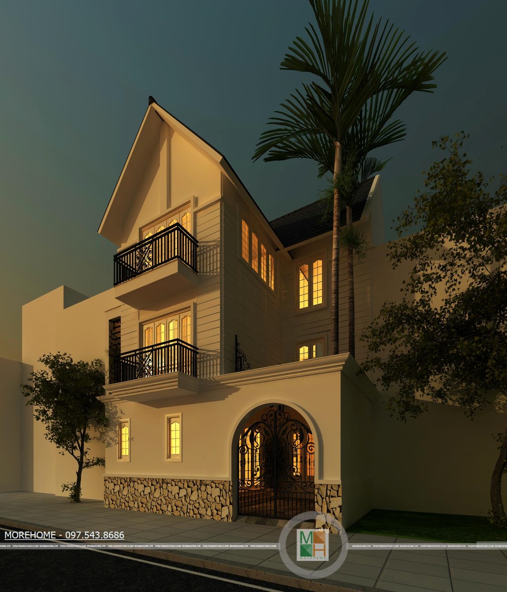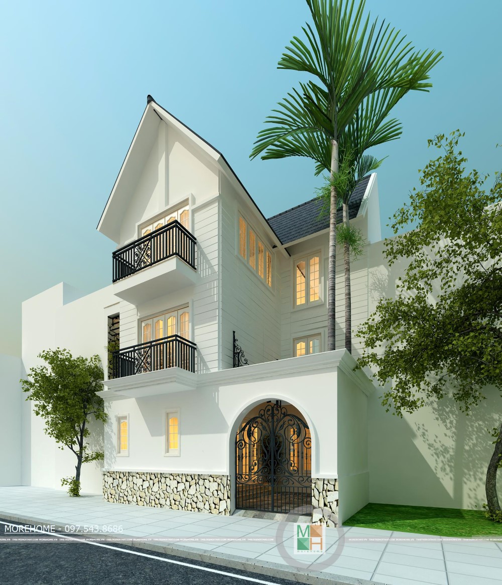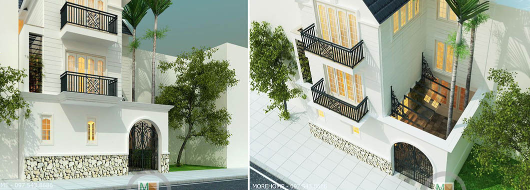 Thiết kế viền ngoài của căn biệt thự được cách tân sáng tạo bằng đá tự nhiên. Thay vì bức tường thô cứng bao quanh tạo sự cứng nhắc và bó buộc, thiết kế đã tạo viên chân bằng đá sáng tạo giúp tăng vẻ đẹp thẩm mỹ cho căn nhà tránh tối đa sự nhàm chán và đơn điệu từ tone màu trắng. Bên cạnh đó, thiết kế hai cửa sổ nhỏ hình chữ nhật đứng như mở ra một không gian khác cho căn biệt thự, mang lại sự ấm áp từ một căn nhà kiên cố, ấm áp và thân thuộc. Ánh sáng sử dụng trong căn biệt thự là ánh sáng vàng ấm áp hòa hợp và tạo sự cân bằng với tone màu trắng bên ngoài giúp không gian trở nên gần gũi, thật sự là một không gian trở về, quây quần và thư giãn của cả gia đình.
