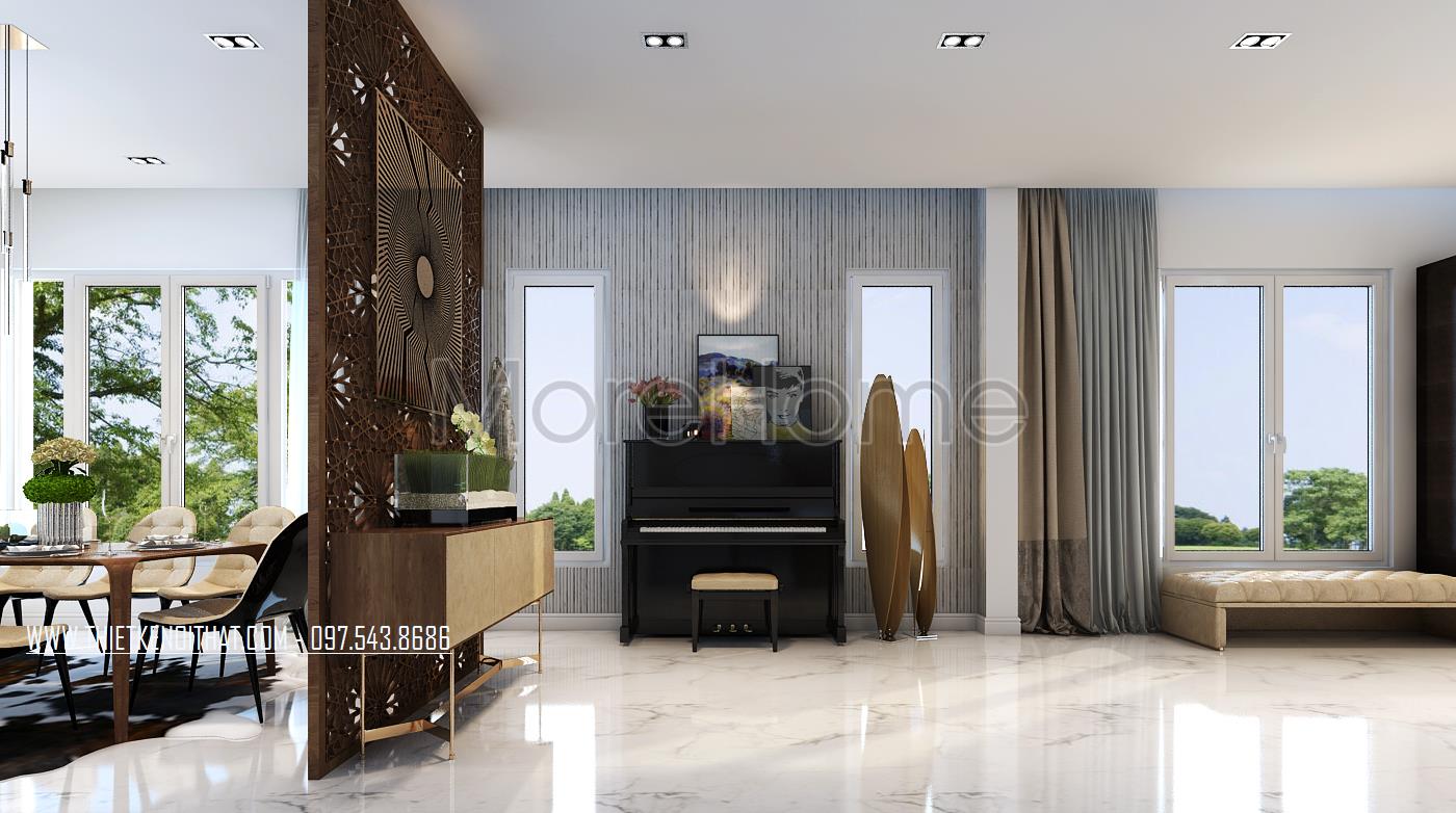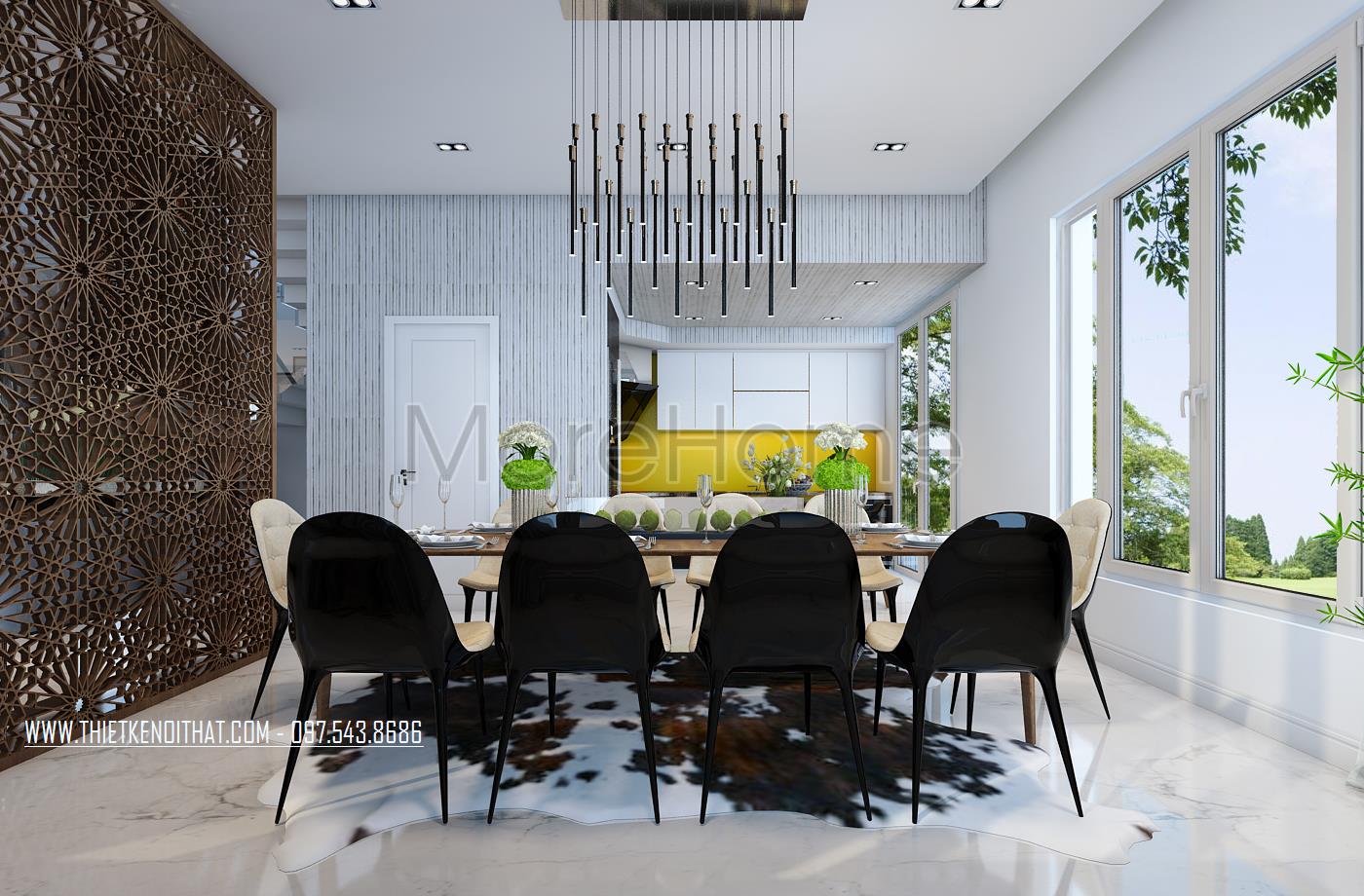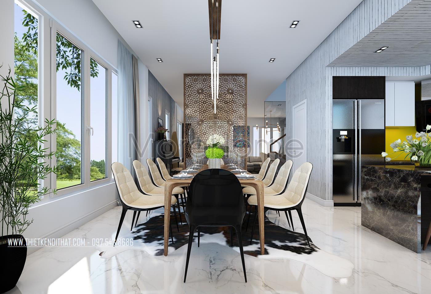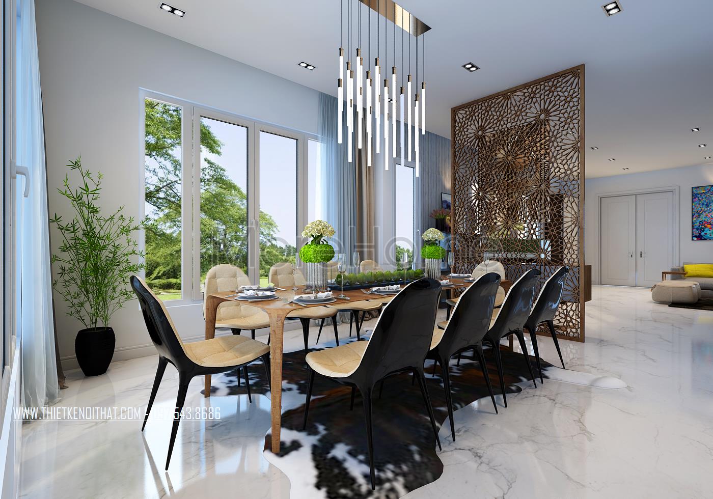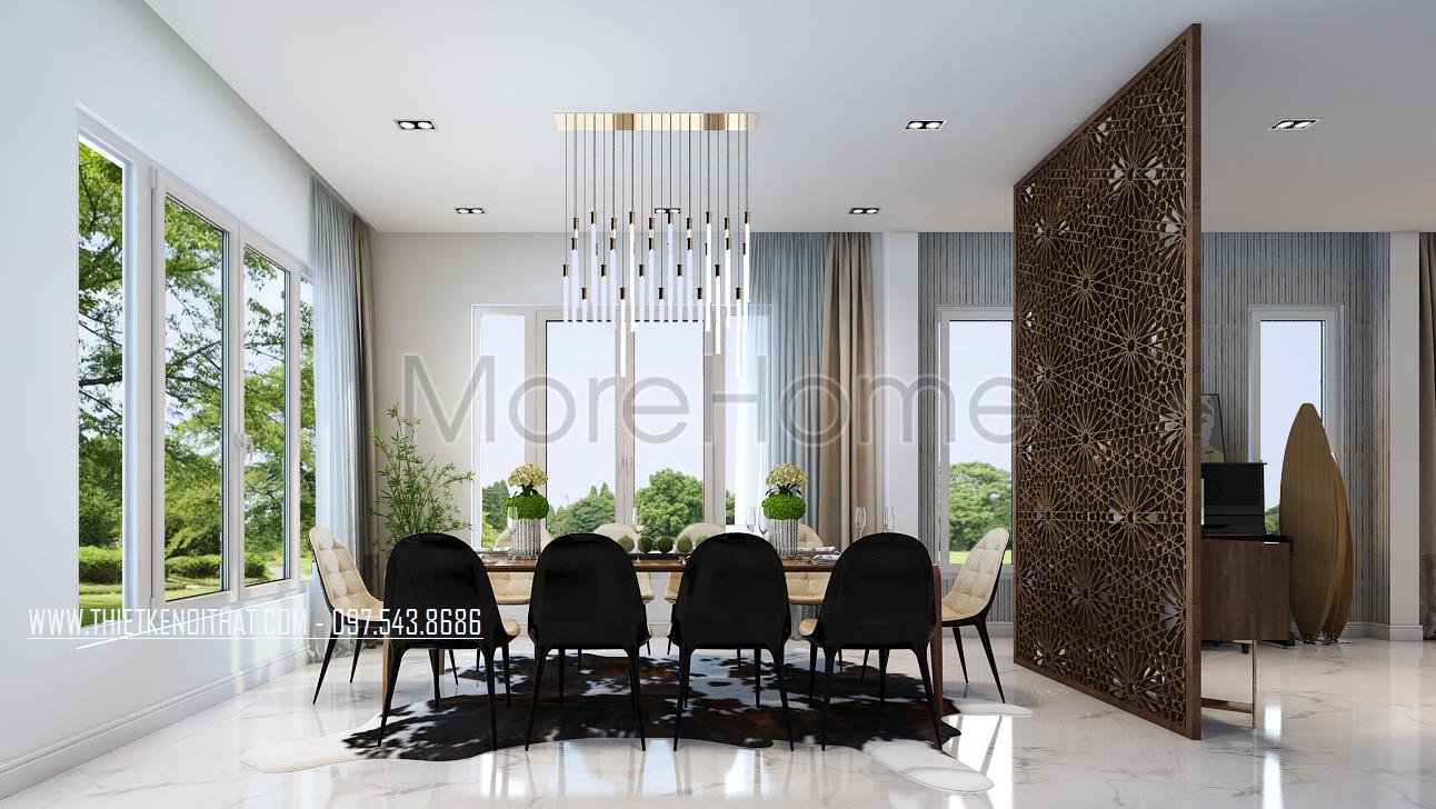 Thiết kế nội thất bàn ăn và bếp liền kề với view rộng tạo độ mở cho căn phòng. Bàn ăn thiết kế cách tân sáng tạo không theo khuôn mẫu thông thường giúp tạo sự mới lạ và thu hút sự chú ý của mọi người. Bức vách chắn với hoa văn tinh xảo được thiết kế tỉ mỉ là một trong những điểm nhấn cho không gian này. Thay vì bức tường thô cứng chắn tầm mắt thì kiến trúc sư khéo léo sử dụng thiết kế vách gỗ nhẹ nhàng vừa tạo độ mở cho không gian vừa giảm sự bí bách, đơn điệu của thiết kế 4 bức tường truyền thống.