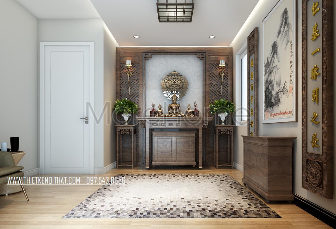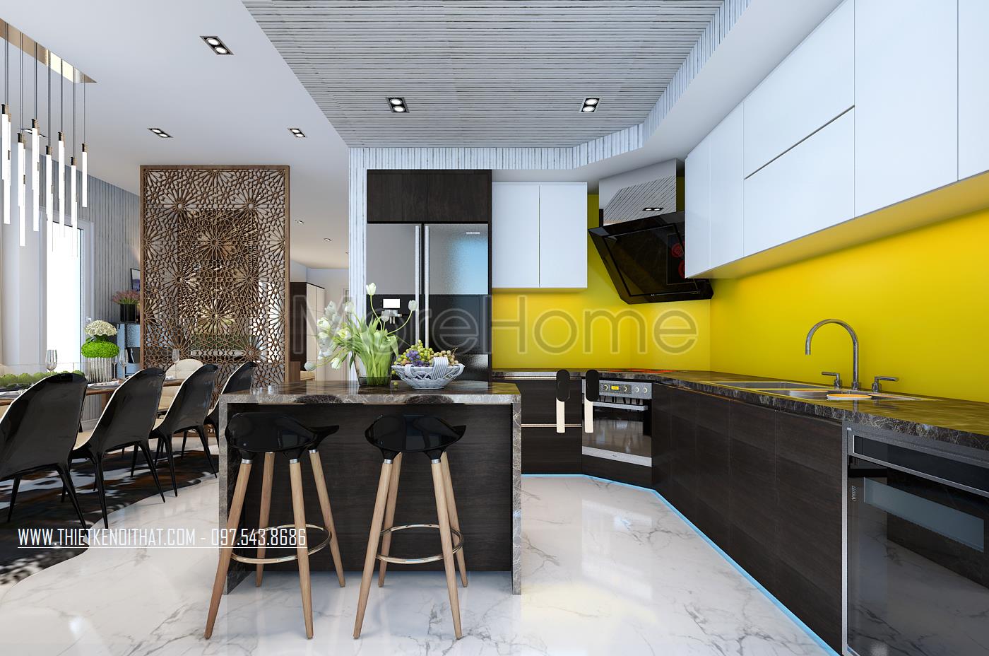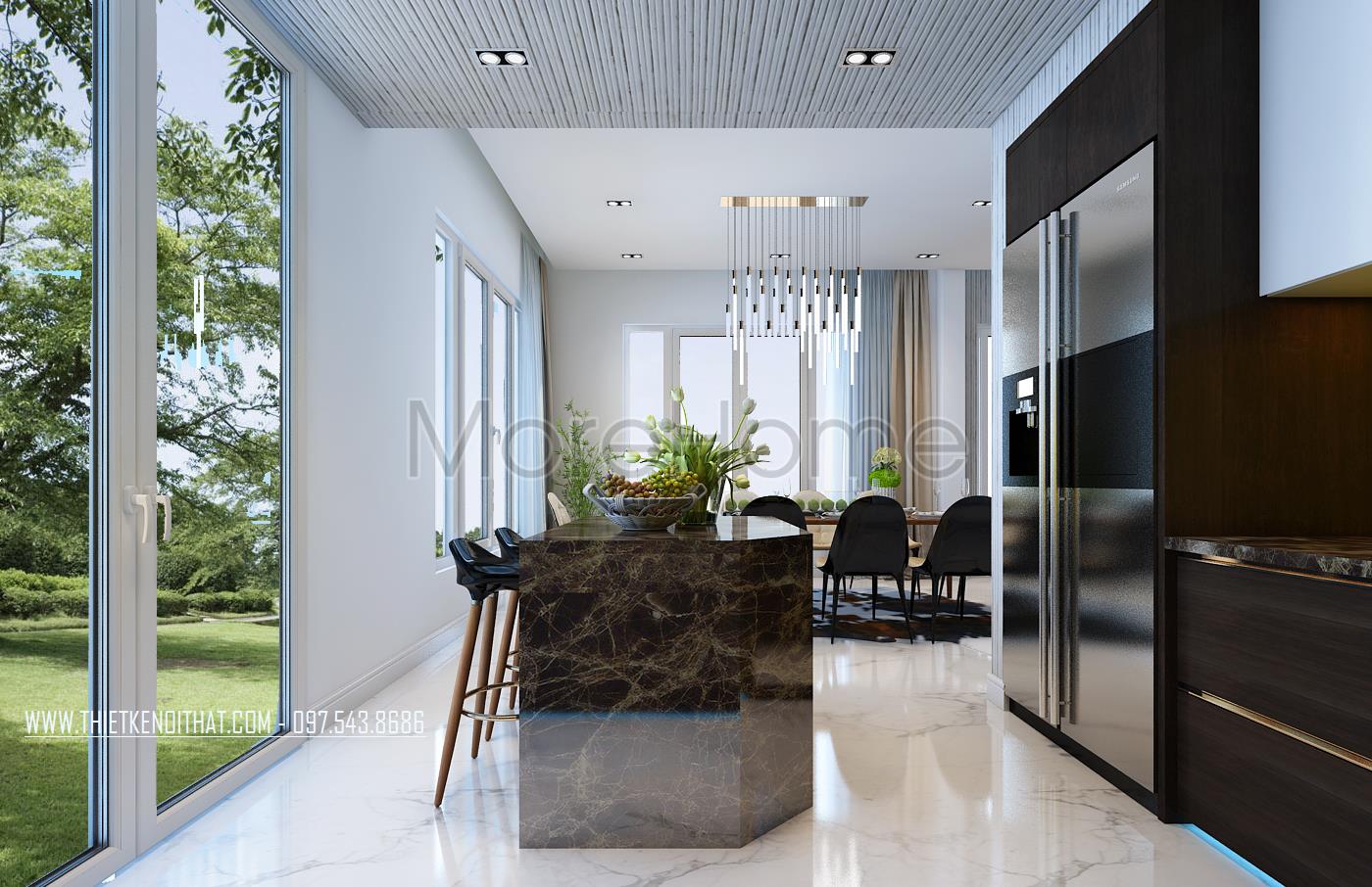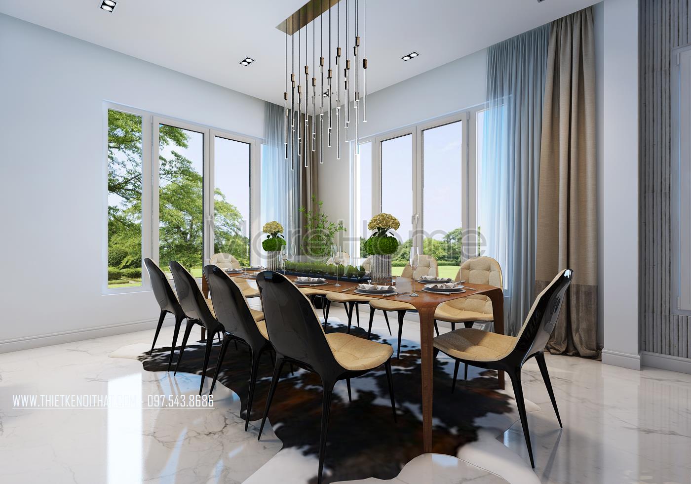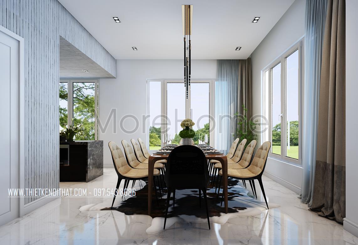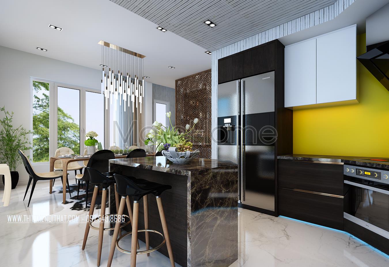 Thiết kế nội thất bàn ăn và bếp liền kề với view rộng tạo độ mở cho căn phòng. Bàn ăn thiết kế cách tân sáng tạo không theo khuôn mẫu thông thường giúp tạo sự mới lạ và thu hút sự chú ý của mọi người. Bức vách chắn với hoa văn tinh xảo được thiết kế tỉ mỉ là một trong những điểm nhấn cho không gian này. Thay vì bức tường thô cứng chắn tầm mắt thì kiến trúc sư khéo léo sử dụng thiết kế vách gỗ nhẹ nhàng vừa tạo độ mở cho không gian vừa giảm sự bí bách, đơn điệu của thiết kế 4 bức tường truyền thống.