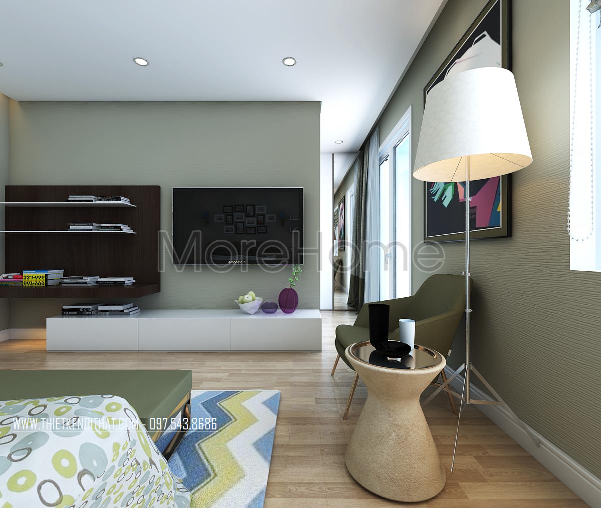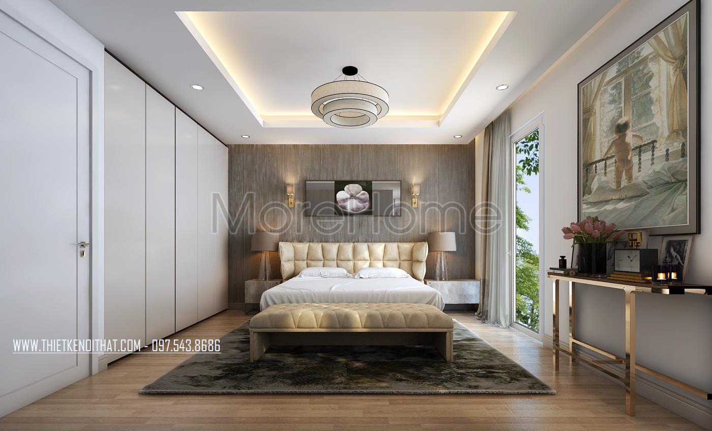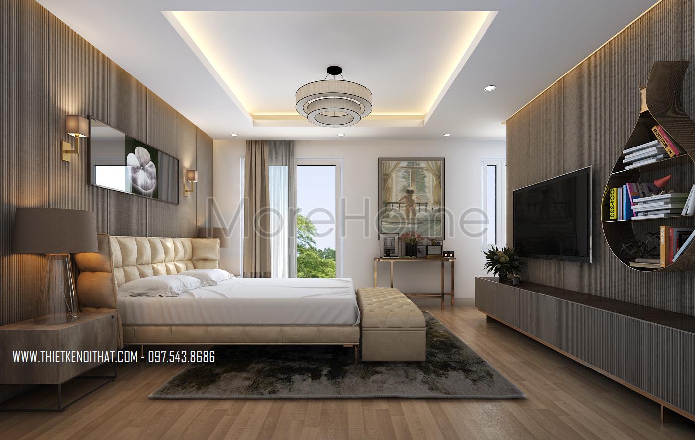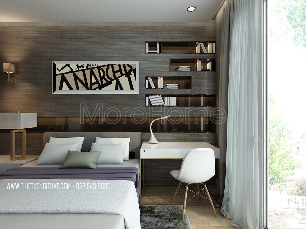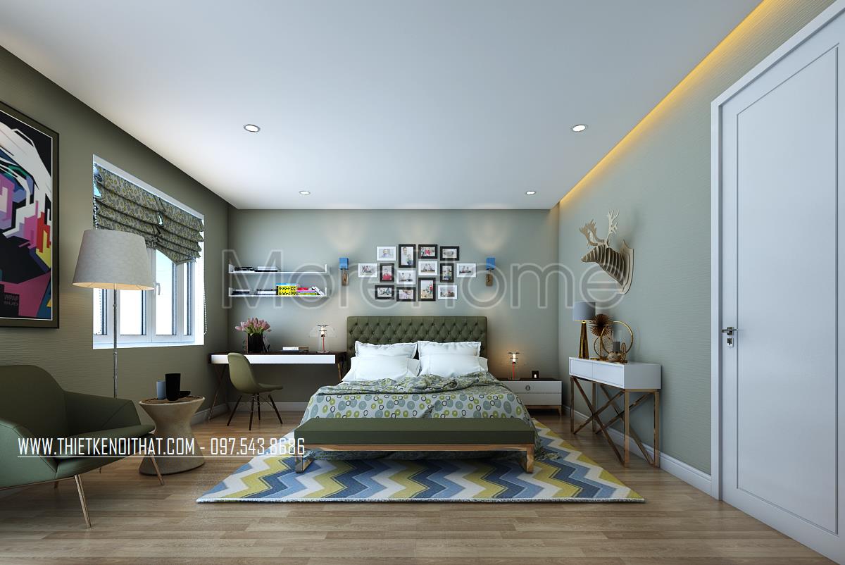 Cuối cùng là thiết kế nội thất phòng ngủ hiện đại. Tone màu nền sáng được sử dụng làm nổi bật lên các đường nét và vật dụng trang trí tạo ấn tượng cho căn phòng. Màu rêu trầm tối được sử dụng khéo léo giúp cân bằng màu sắc và tạo sự hài hòa cho không gian sống. Bên cạnh đó, hiệu ứng ánh sáng và màu sắc còn giúp đem lại cảm giác ấm áp và thân thiện cho không gian sống.