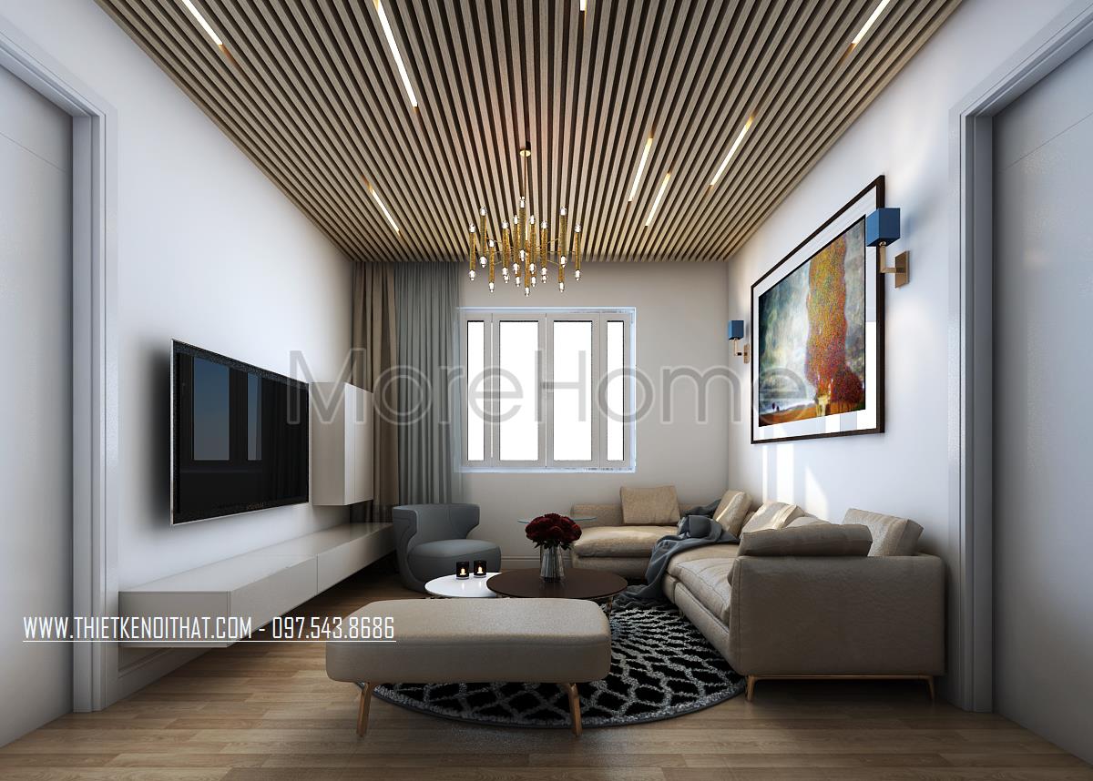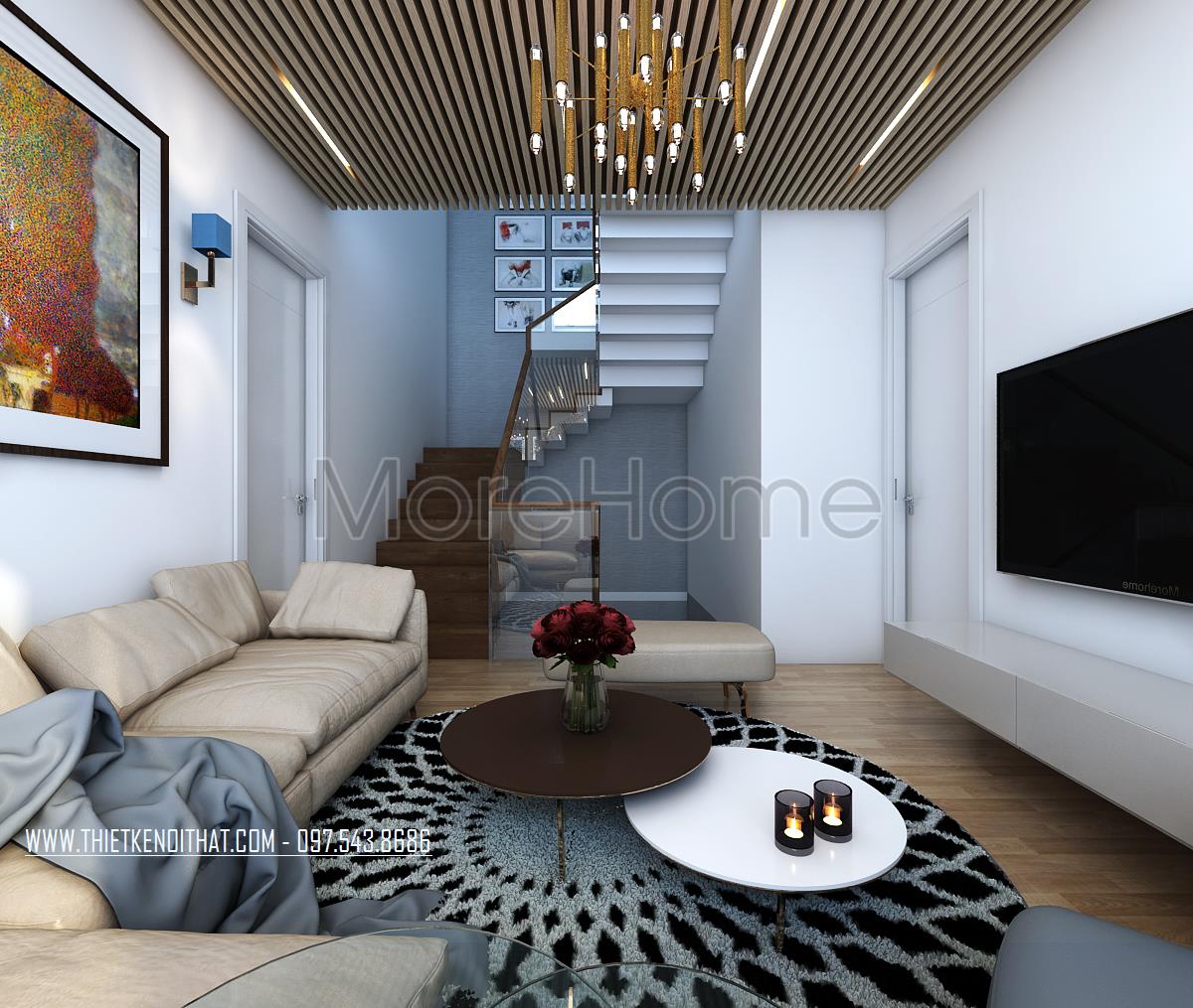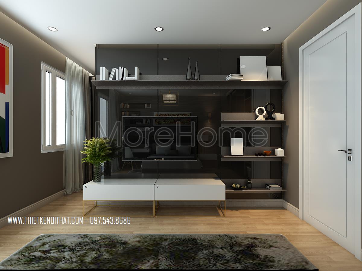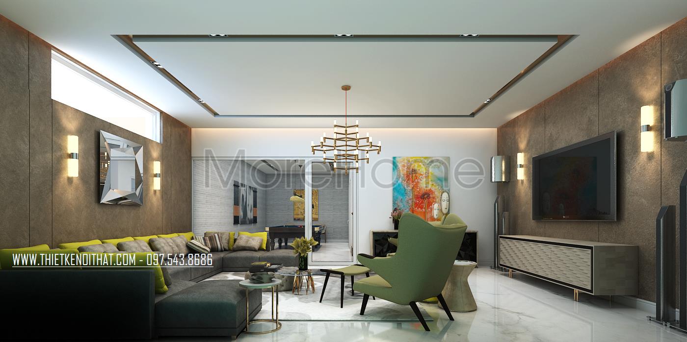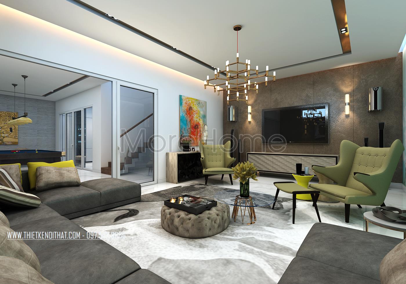 Thiết kế nôi thất phòng khách hiện đại mang đến cảm giác thoáng đãng và thư thái cho giả chủ. Kiến trúc sử khéo léo sử dụng thiết kế với tone màu nhẹ nhàng phối kết hợp với tone màu trầm tối từ thảm trải sàn hay kệ, bàn … tạo sự cân bằng và dung hòa về màu sắc trang trí. Thiết kế của sổ mở rộng giúp mang ánh sáng tự nhiên vào căn phòng, mang lại sự tươi trẻ cho không gian.