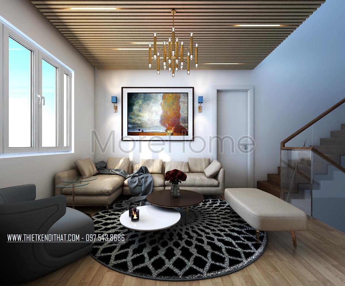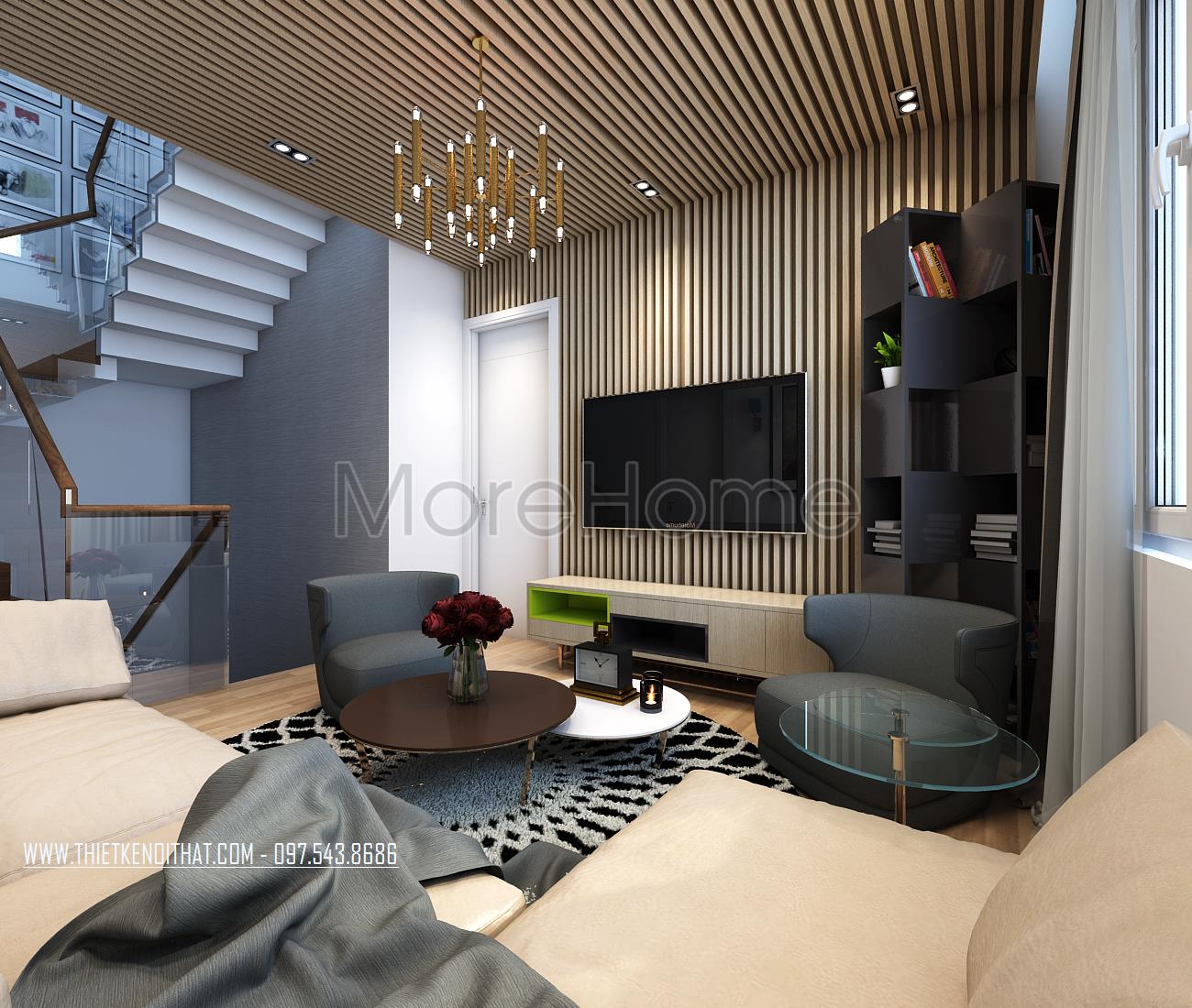 Thiết kế không gian tiếp theo là phòng khách nhỏ dành riêng cho các buổi sinh hoạt gia đình nhỏ ấm cúng và gần gũi, cửa sổ rộng đón ánh sáng tự nhiên vào căn phòng mang lại hứng khởi và niềm vui cho các thành viên. Không gian nhỏ, thiết kế đơn giản, không nhấn mạnh quá nhiều vào đường nét mà thay vào đó là các nét thẳng gọn gàng không cầu kỳ hay kiểu cách. Chính thiết kế tối giản này đã mang lại sự tự nhiên, hiện đại mà không kém phần sang trọng, ấn tượng.