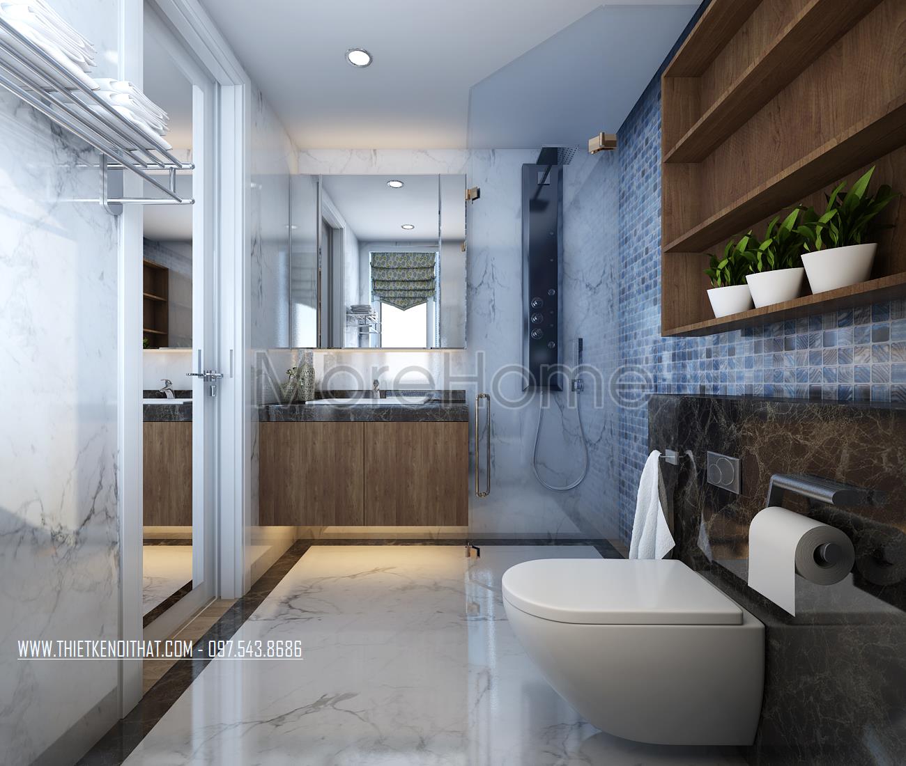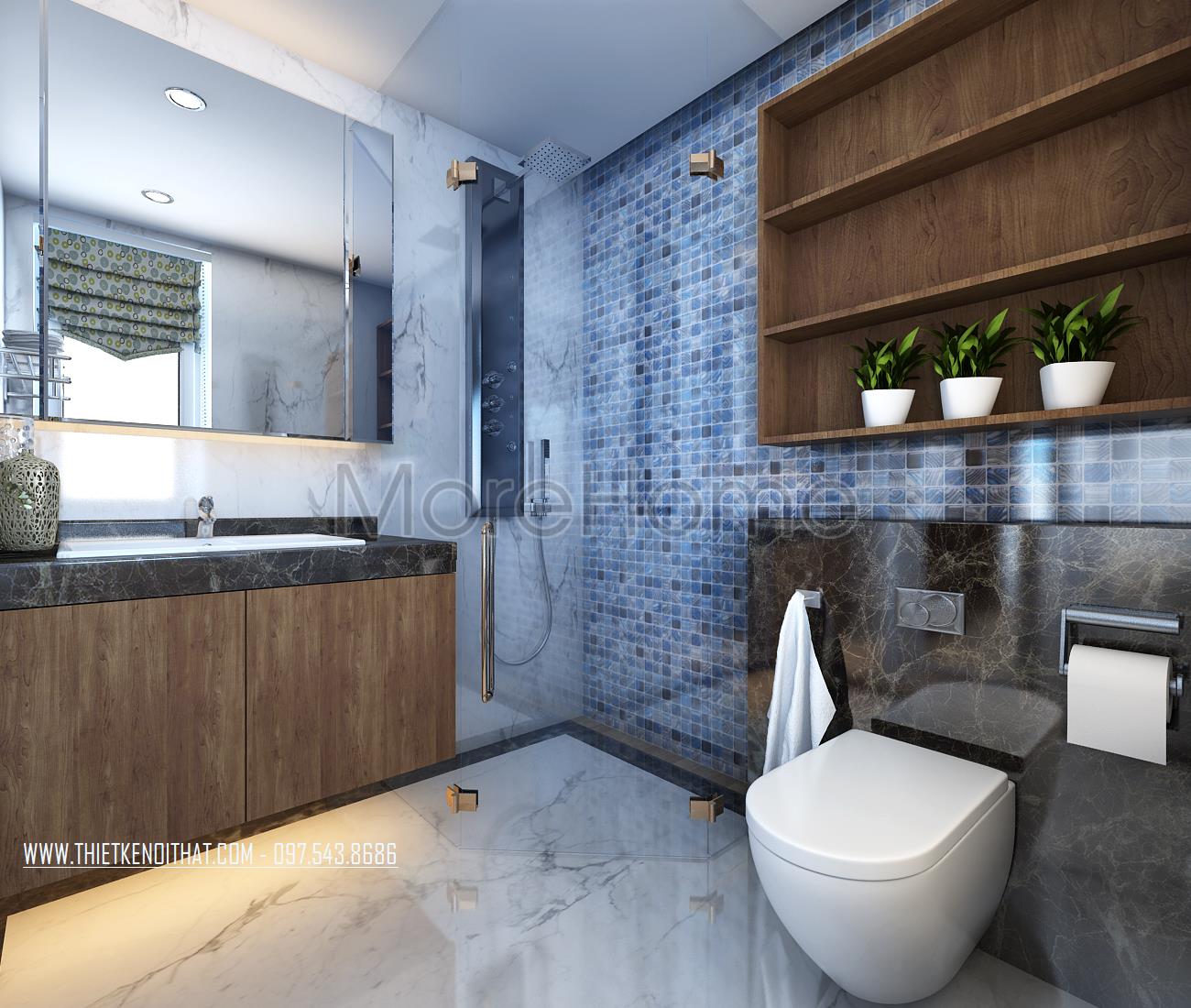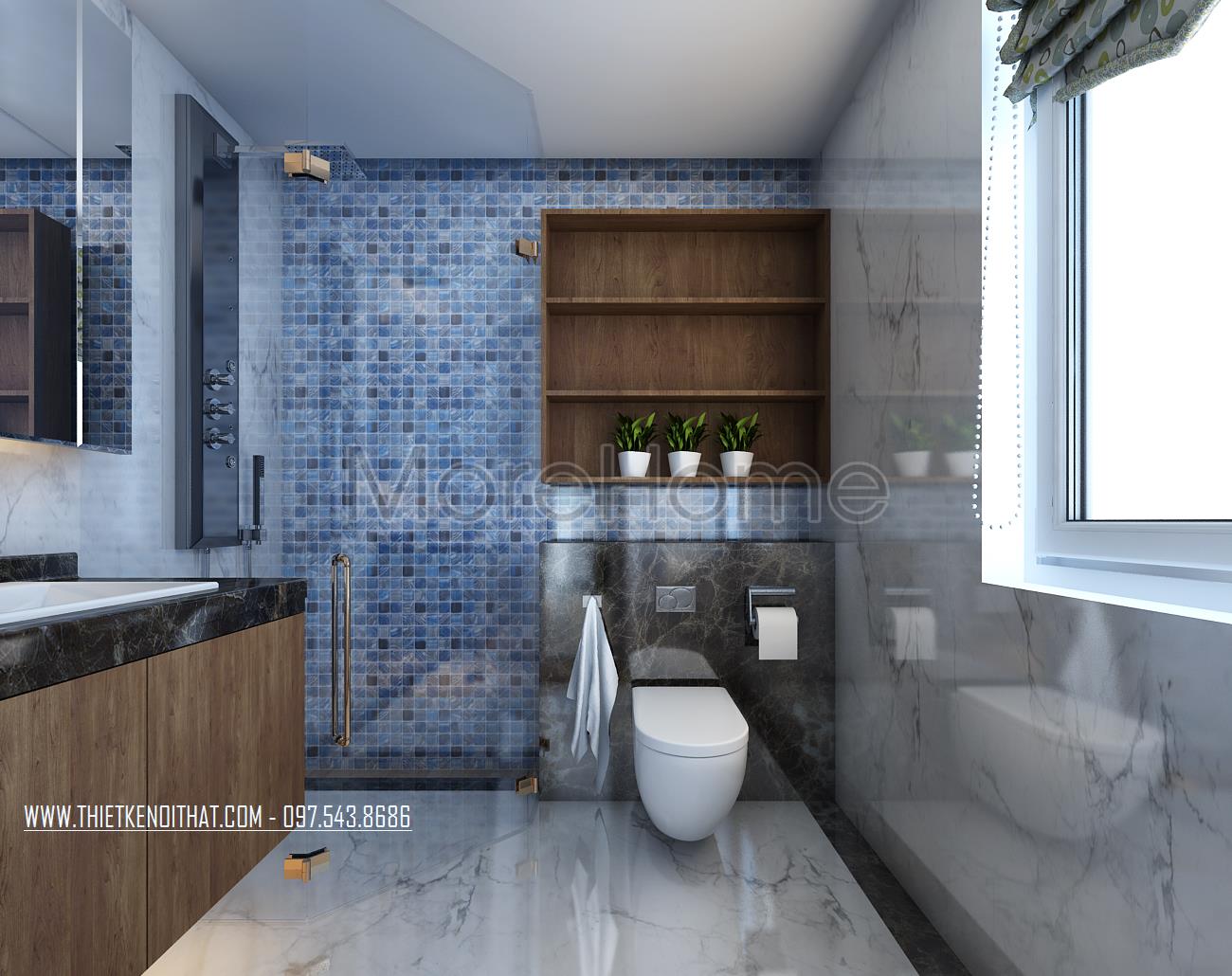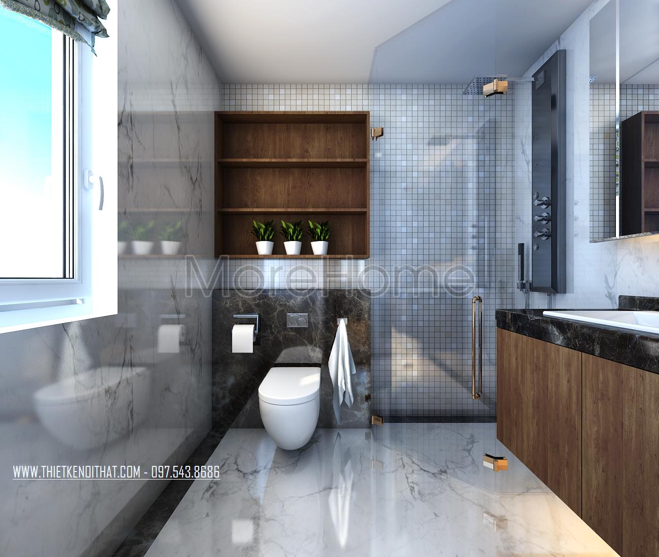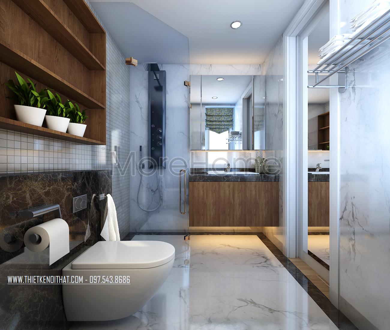 Thiết kế nội thất phòng tắm hiện đại sử dụng các vật liệu nhẹ như kính cường lực và gương làm vật liệu chính mang đến cảm giác mở rộng và cơi nới về mặt không gian. Bên cạnh đó, việc sử dụng khéo léo các thiết kế tủ gỗ ngăn nhẹ nhàng vừa giúp tăng thêm tính công năng cho căn phòng, vừa mang lại sự trẻ trung, hiện đại cho không gian.