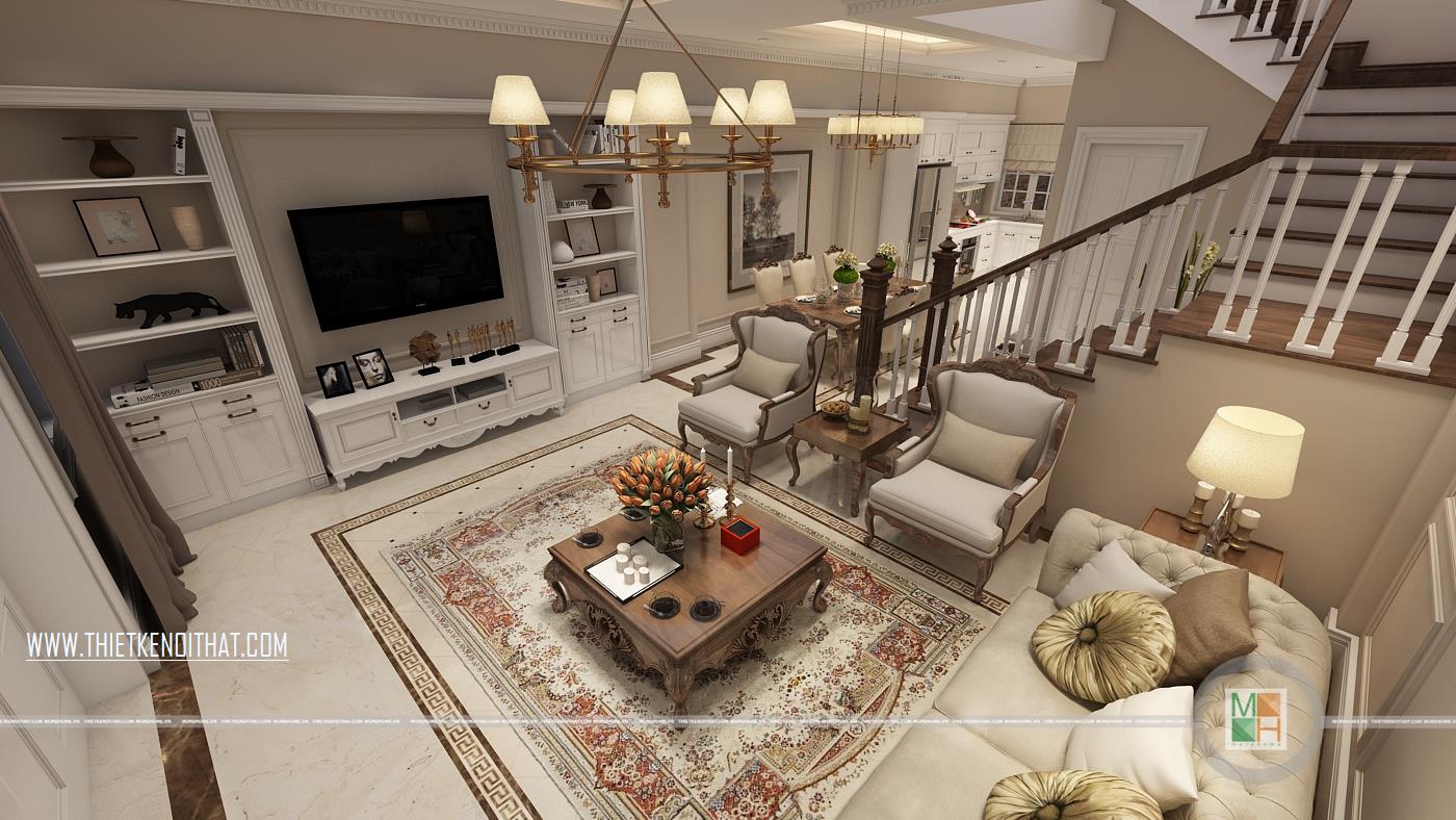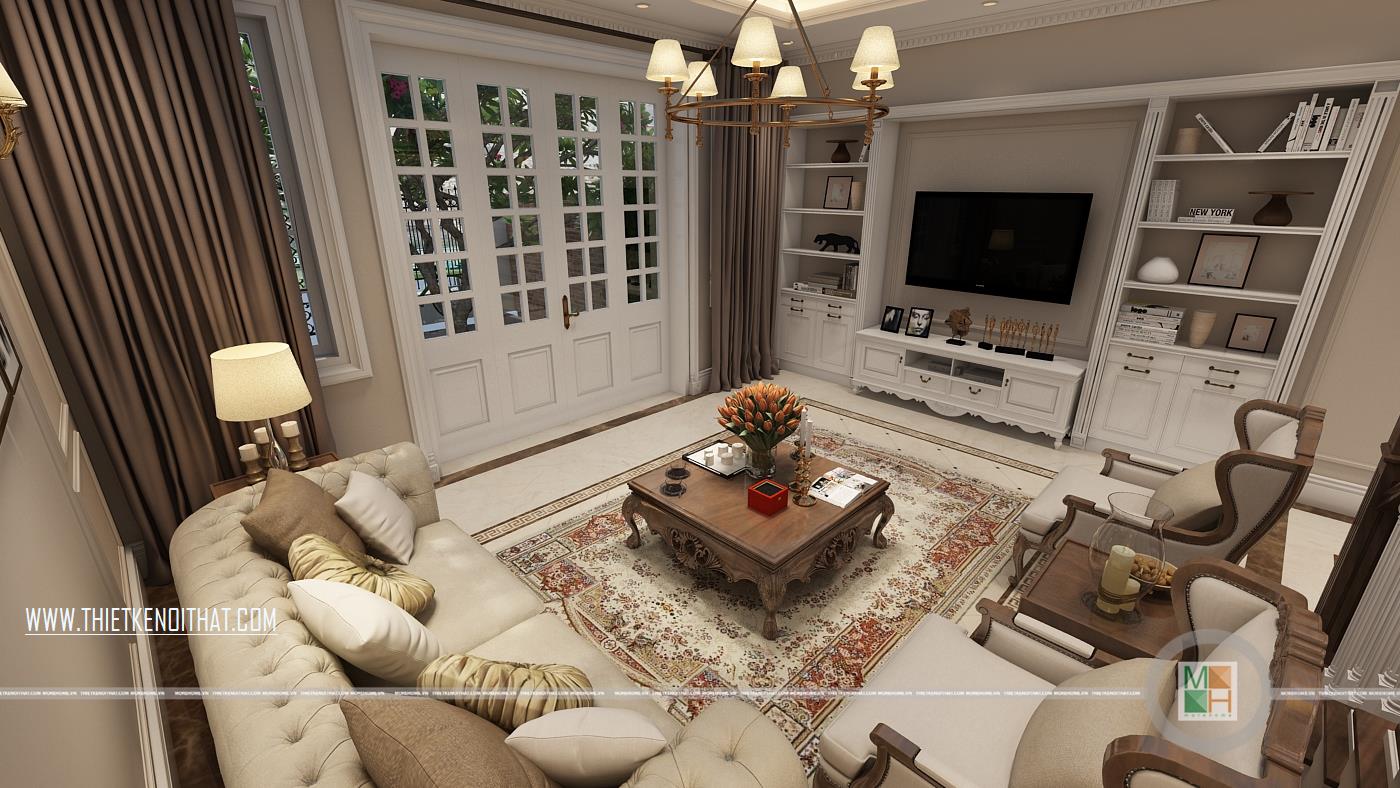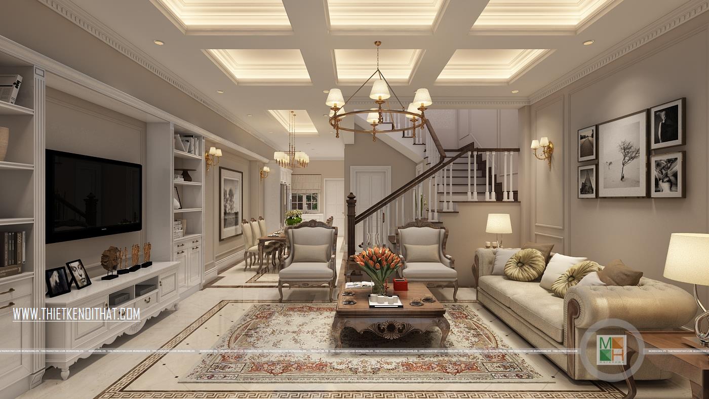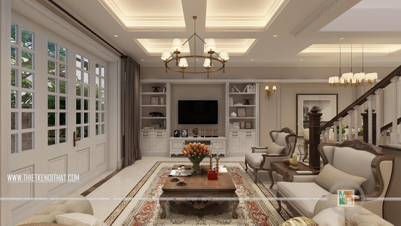 Tuy nhiên, thay vì lấy điểm nhấn là ánh sáng, và cảm giác tươi mới, kiến trúc sư lại khéo léo chuyển hướng sự chú ý của gia chủ đến đường nét và cảm giác ấm áp và căn nhà đem lại. Ngoài ra, thiết kế tủ đứng đường như đồng nhất với tường vừa đảm bảo tính công năng của đảm bảo tính thẩm mỹ và phần nào giúp mở rộng không gian. Thiết kế tường bao quanh sử dụng các trang trí nhẹ nhàng để tránh gây cảm giác nhàm chán và thể hiện đồng bộ nét cổ điển của cả căn nhà. Sự kết hợp của đường nét trên các thiết kế tủ gỗ, kệ, tường hay sofa tuy đều là những chi tiết thiết kế tạo điểm nhấn và khắc họa rõ ràng phong cách tân cổ điển.