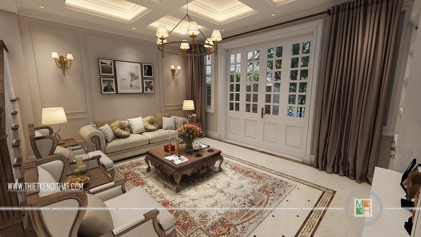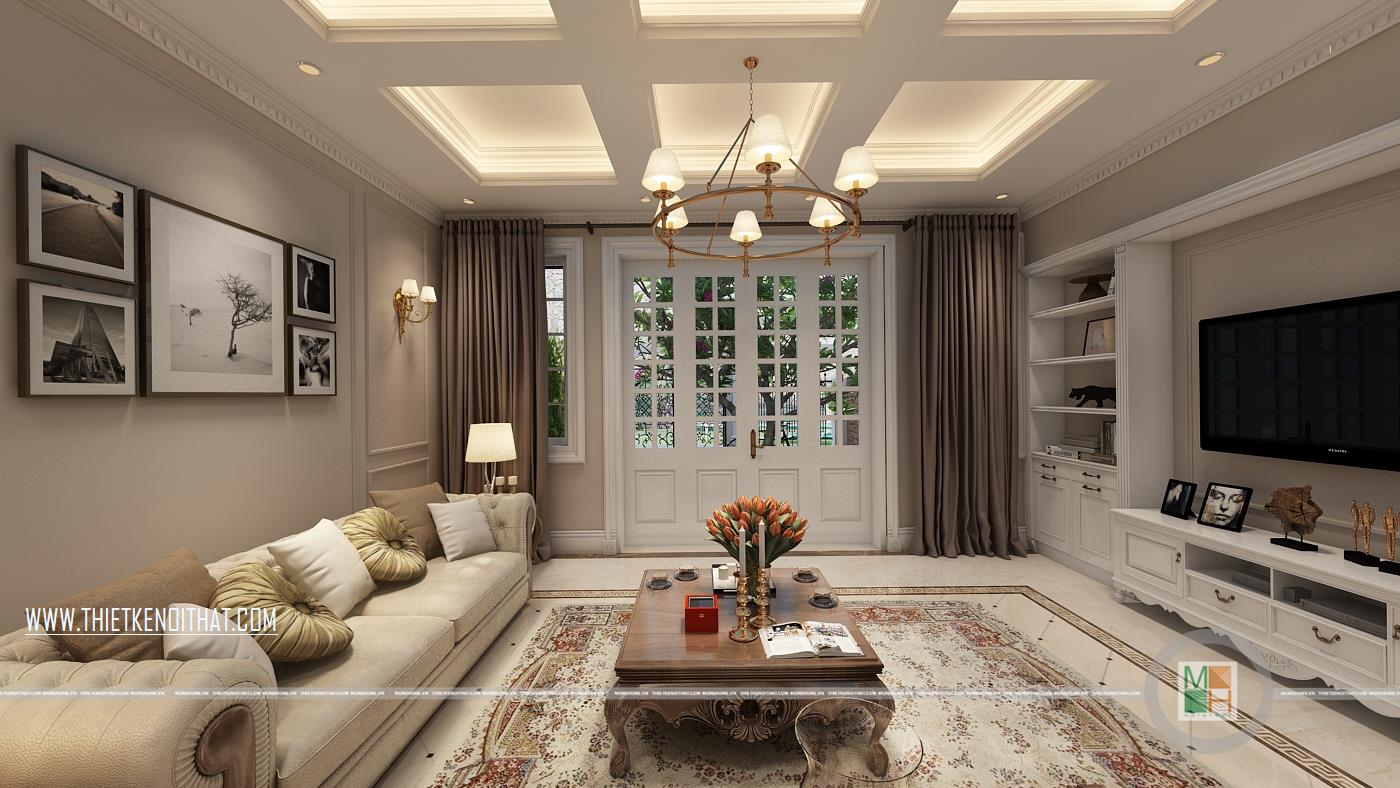 Với thiết kế tân cổ điển này, kiến trúc sư sử dụng tông màu nâu xám nhẹ nhàng, màu sắc trung tính không quá nổi bật nhưng cũng không quá đơn điệu và nhàm chán như sắc trắng. Bên cạnh đó, với tông màu nâu xám này, chúng ta còn dễ dàng cảm nhận được sự ấm áp do sự ăn nhập hài hòa giữa màu sắc và ánh sáng. Thiết kế phòng khách tân cổ điển lấy ánh sáng và đường nét là điểm nhấn chính.
