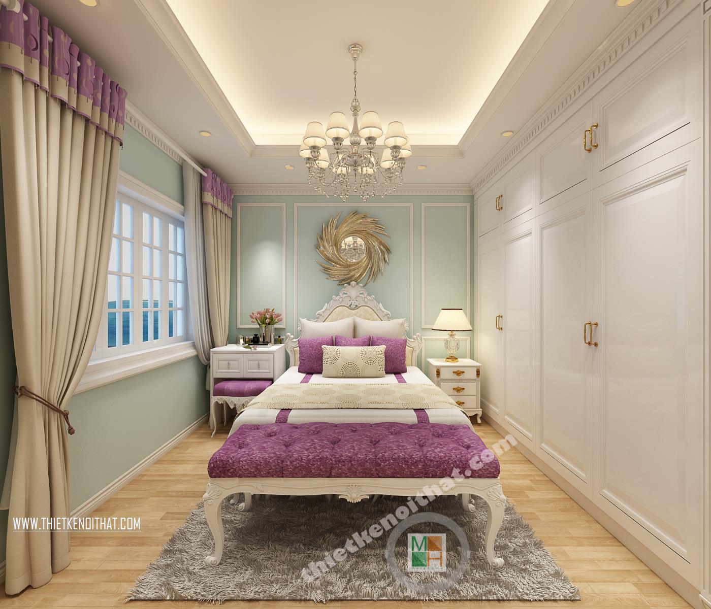 Thiết kế phòng ngủ tiếp theo được thiết kế tương tự với tông màu xanh là điểm nhấn. Các thiết kế trạm khắc và trang trí trên các vật dụng toát lên vẻ đẹp tân cổ điển đầy thu hút.Thiết kế đối xứng lấy giường ngủ làm trung tâm tạo cảm giác hài hòa và đồng điệu cho căn phòng.