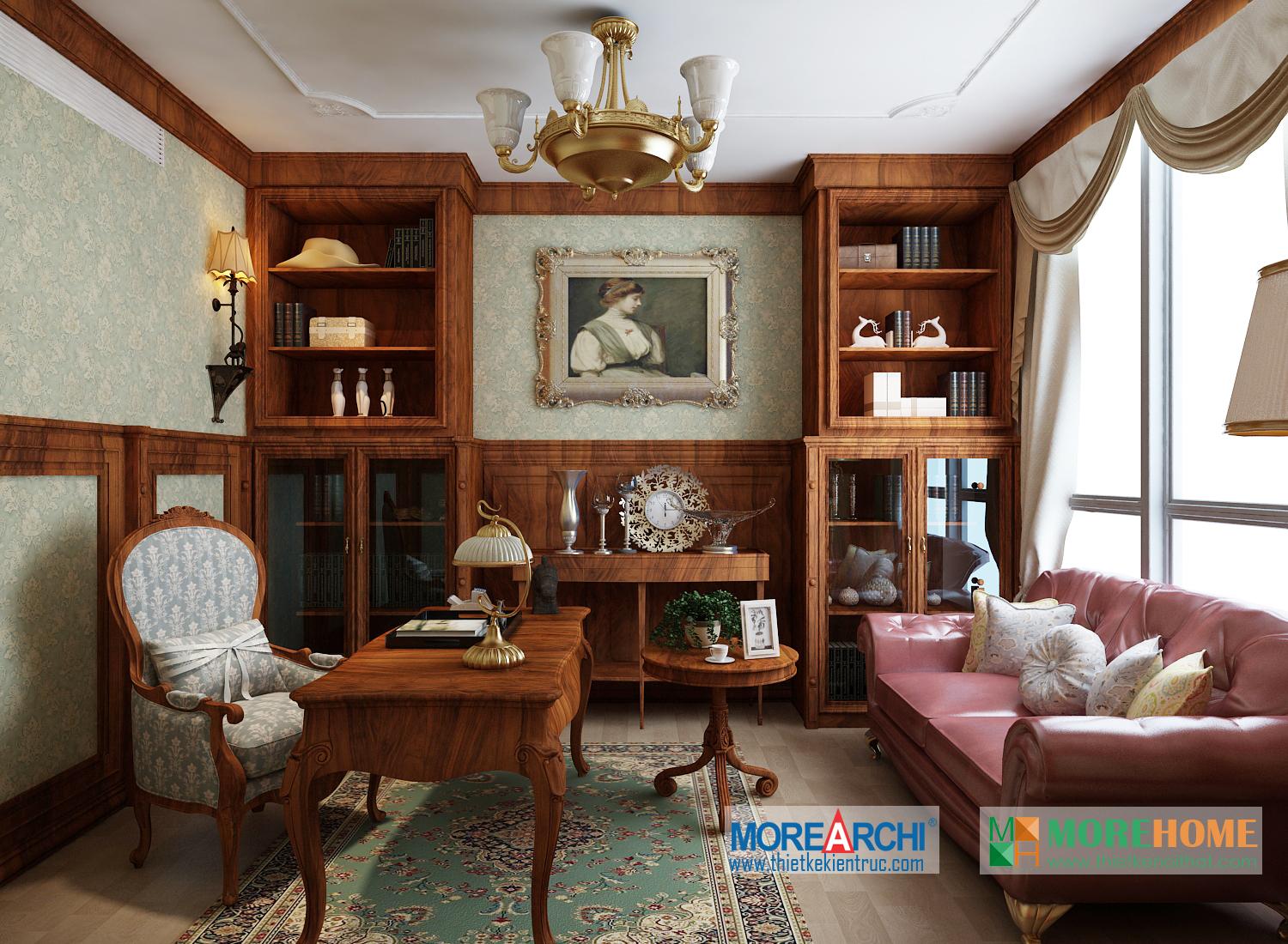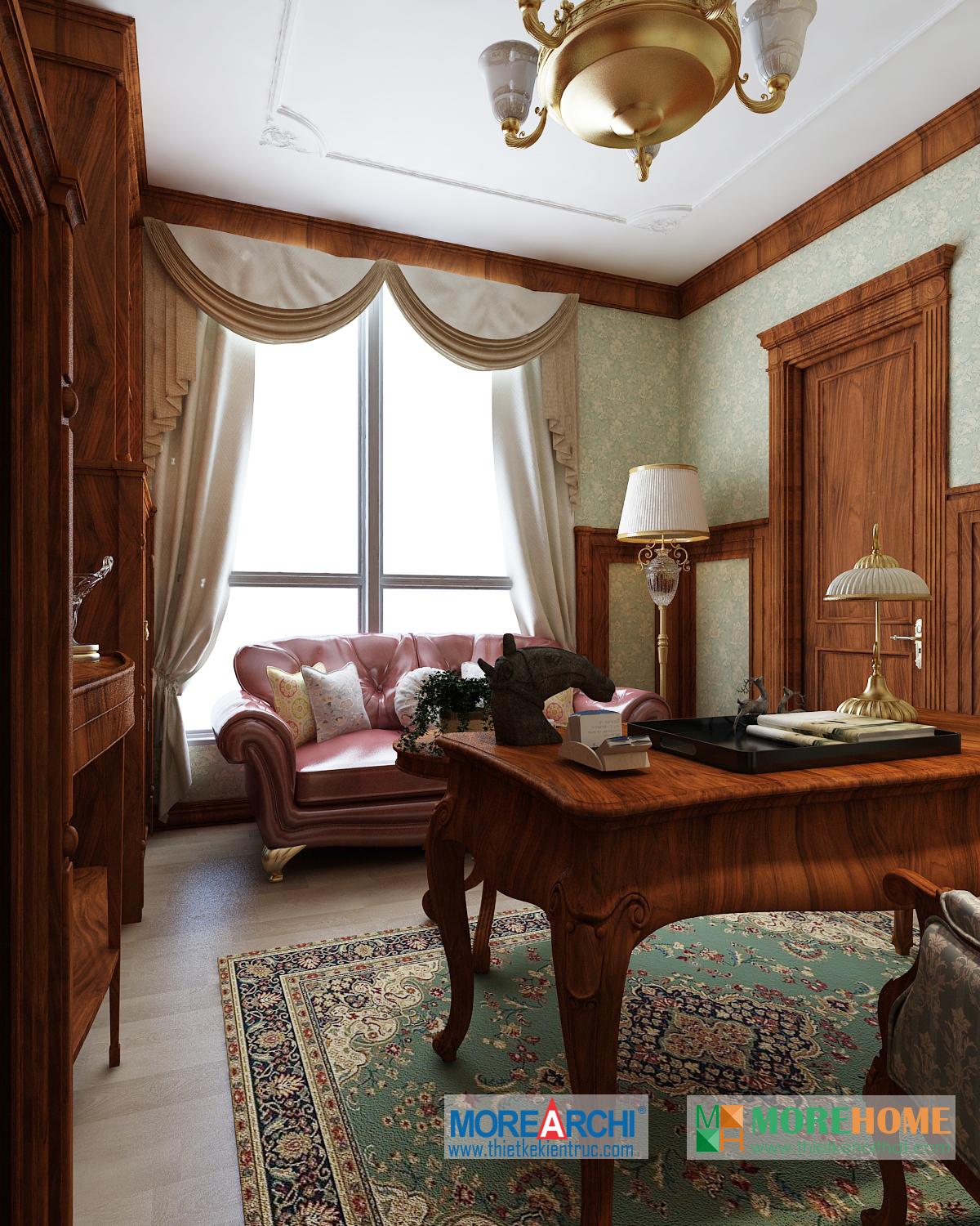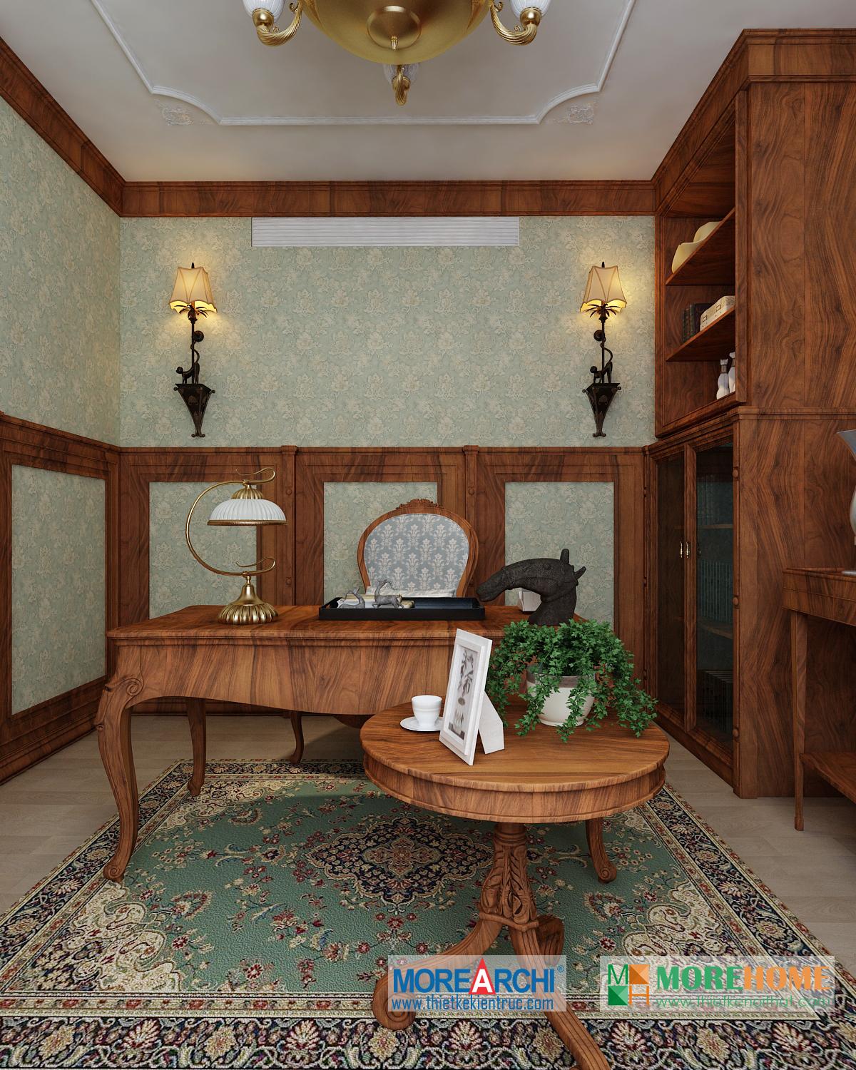 Thiết kế phòng làm việc mang phong cách tân cổ điển. Tông màu nâu trầm veneer được sử dụng mang đến một không gian thiết kế sang trọng. Thay vì thiết kế tường quét sơn truyền thống, kiến trúc sư đã sử dụng giấy dán tường để tránh sự nhàm chán và đơn điệu cho căn phòng.