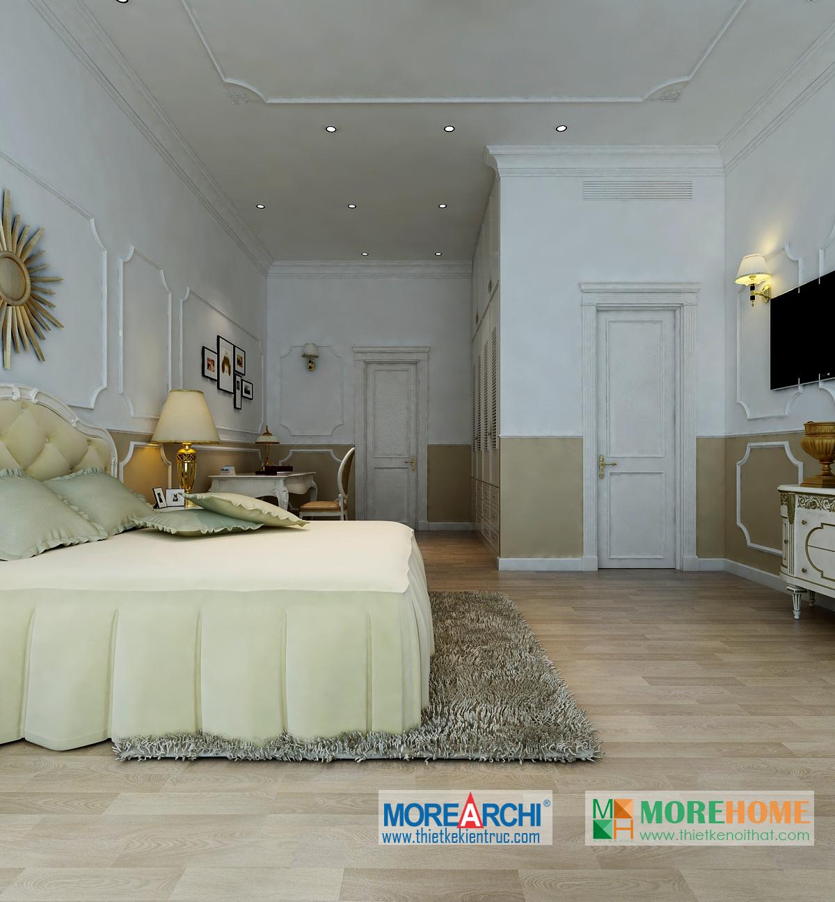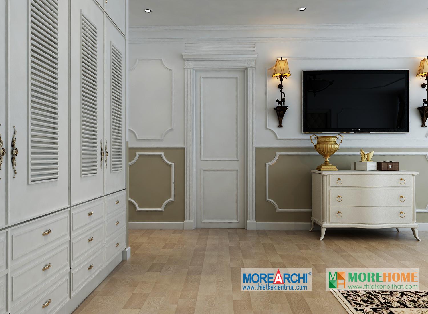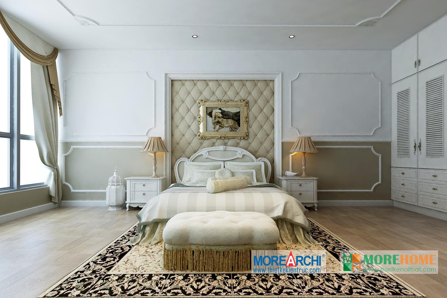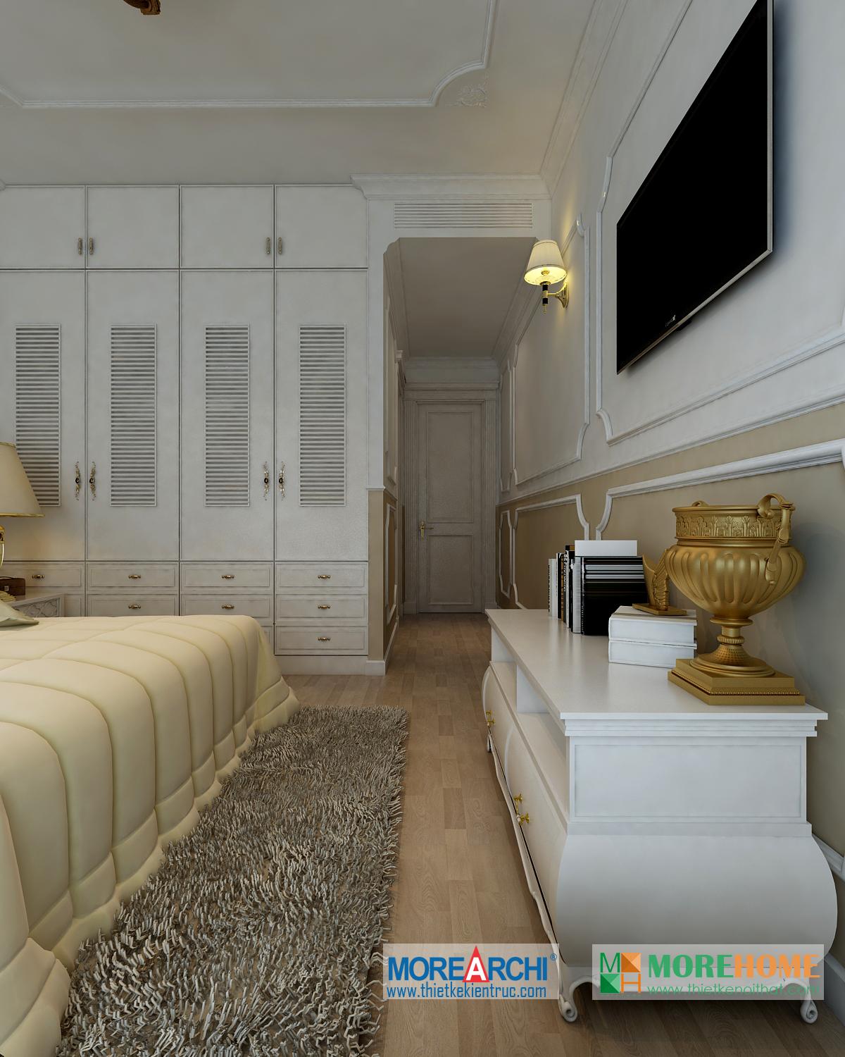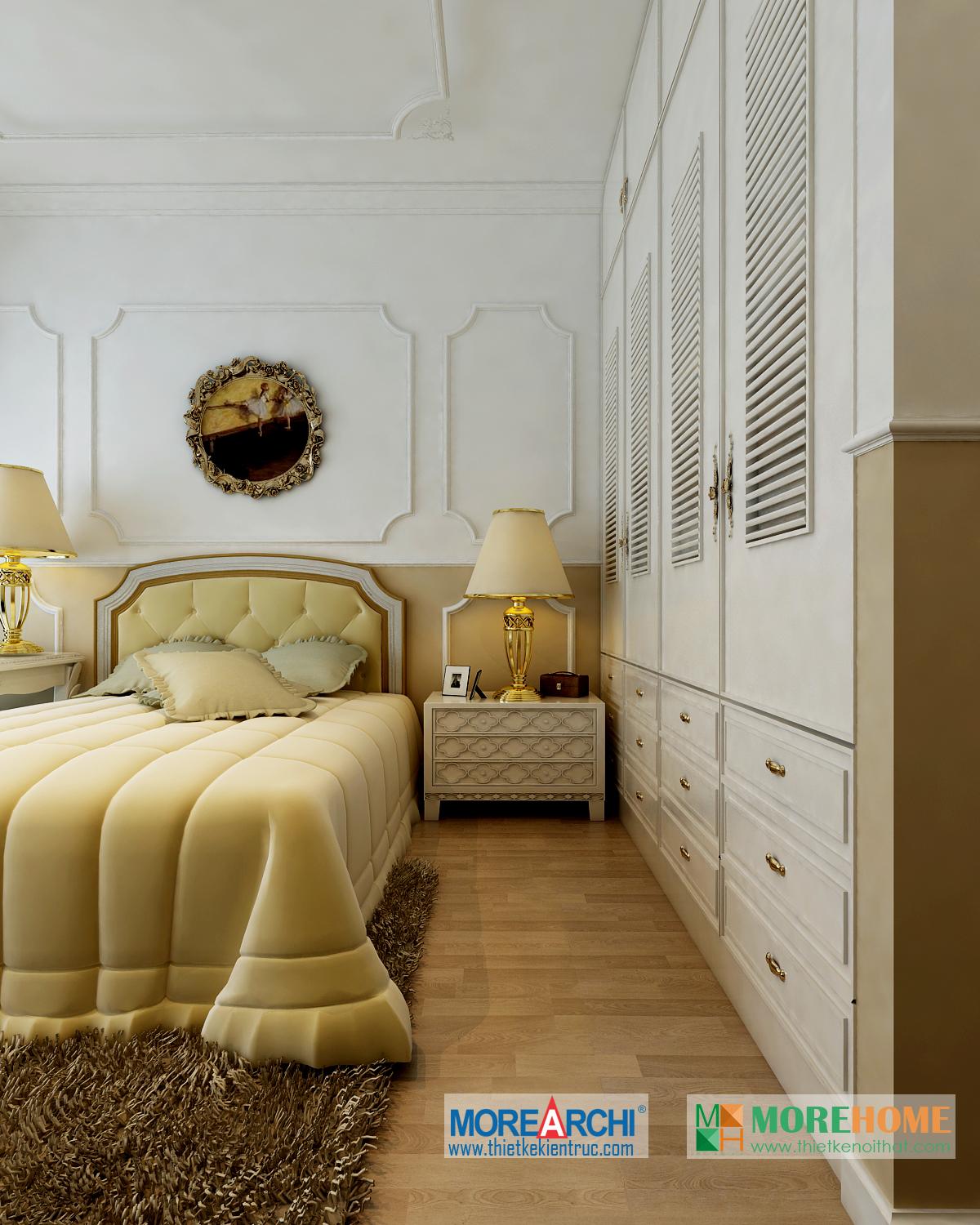 Thiết kế phòng ngủ mang đến cho gia chủ cảm giác sang trọng và ấm cúng. Tông màu trắng sáng kết hợp hài hòa với thiết kế tân cổ điển và đường cong nhẹ nhàng nổi bật. Hệ thống tủ gỗ thiết kế gần như đồng nhất tạo không gian lớn và mở, tạo diện tích cho không gian đa năng, phù hợp với các gia đình với trẻ nhỏ.