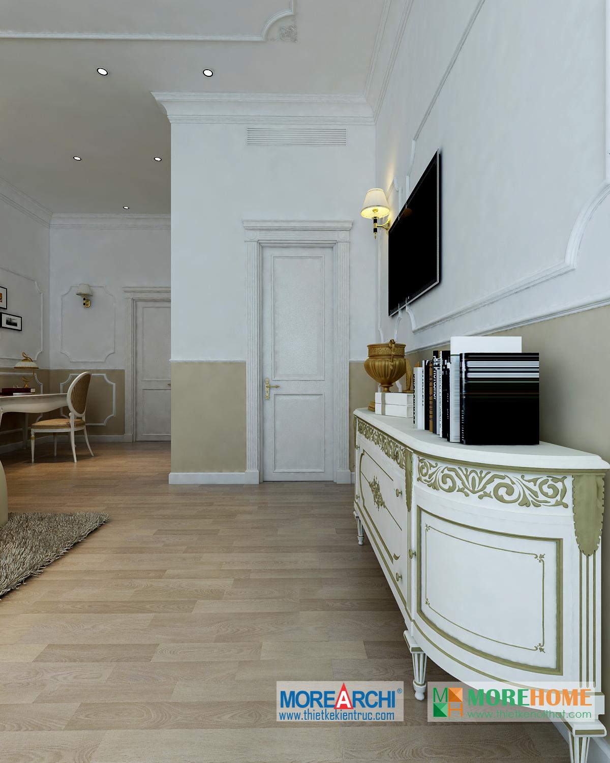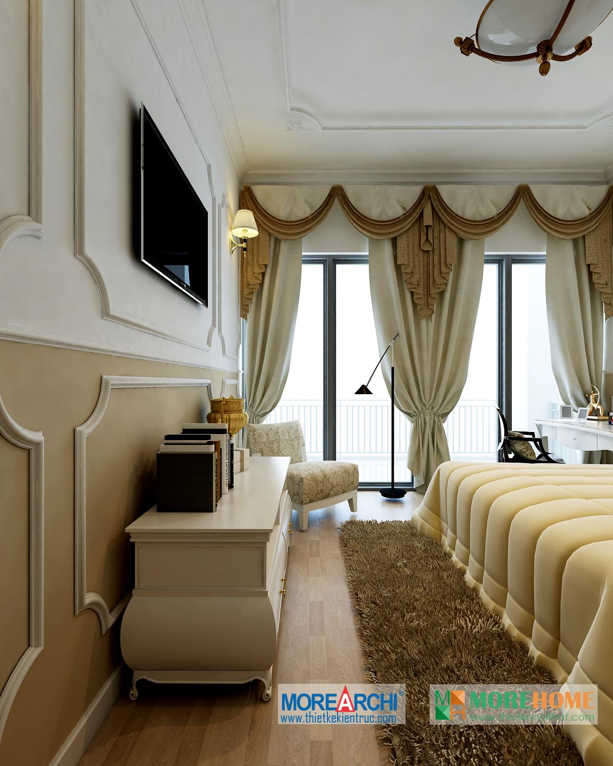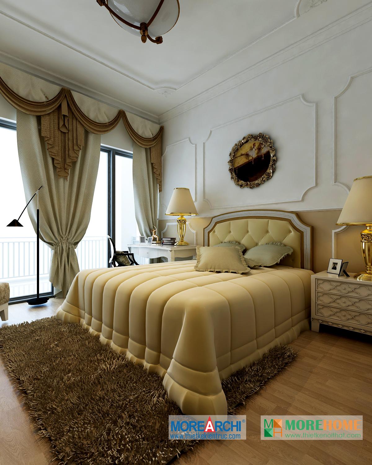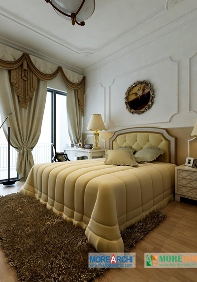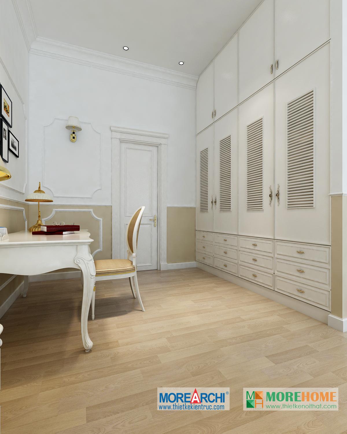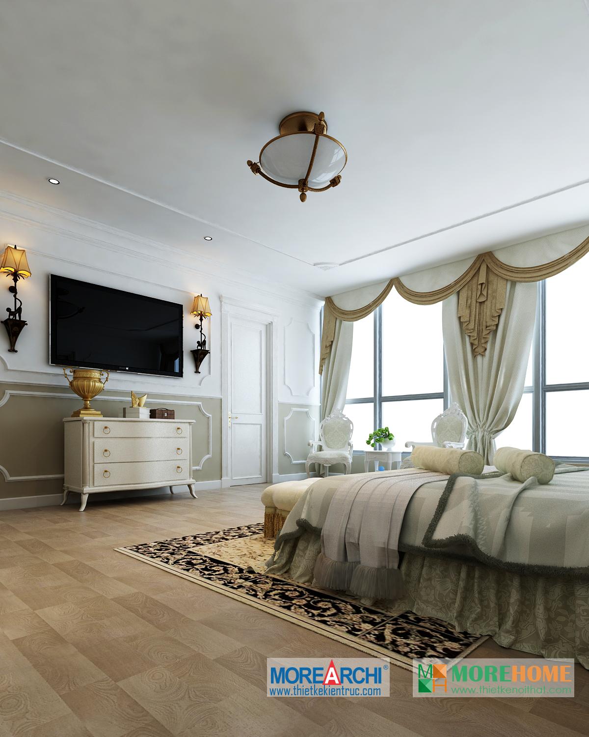 Thiết kế phòng ngủ mang đến cho gia chủ cảm giác sang trọng và ấm cúng. Tông màu trắng sáng kết hợp hài hòa với thiết kế tân cổ điển và đường cong nhẹ nhàng nổi bật. Hệ thống tủ gỗ thiết kế gần như đồng nhất tạo không gian lớn và mở, tạo diện tích cho không gian đa năng, phù hợp với các gia đình với trẻ nhỏ.