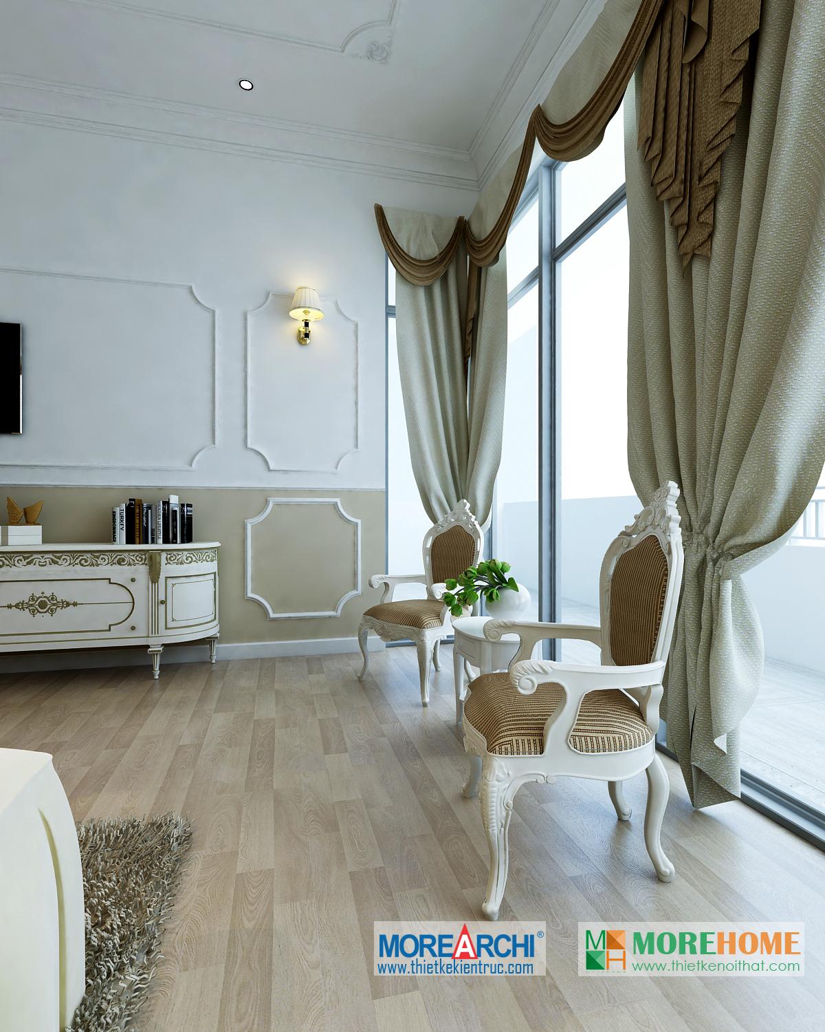 Một trong những điểm nhấn đáng chú ý của căn phòng là không gian hướng sáng khá nhiều. Thiết kế nội thất tân cổ điển chú trọng ánh sáng tự nhiên, tận dụng tối đa không gian hướng sáng mang đến sức sống cho không gian phòng và các khu sinh hoạt chung.