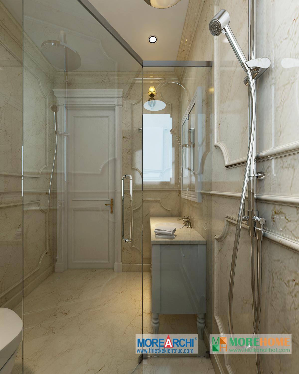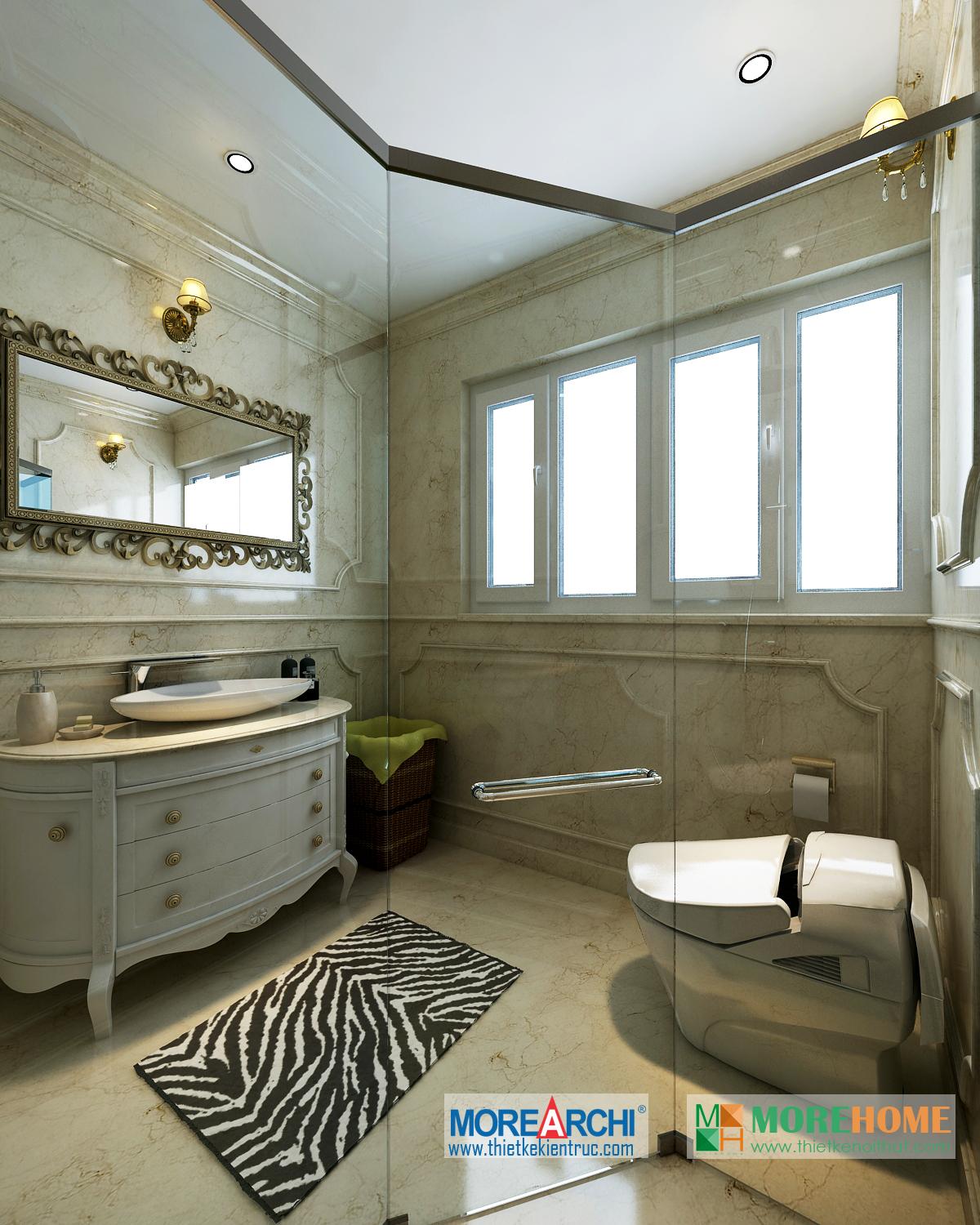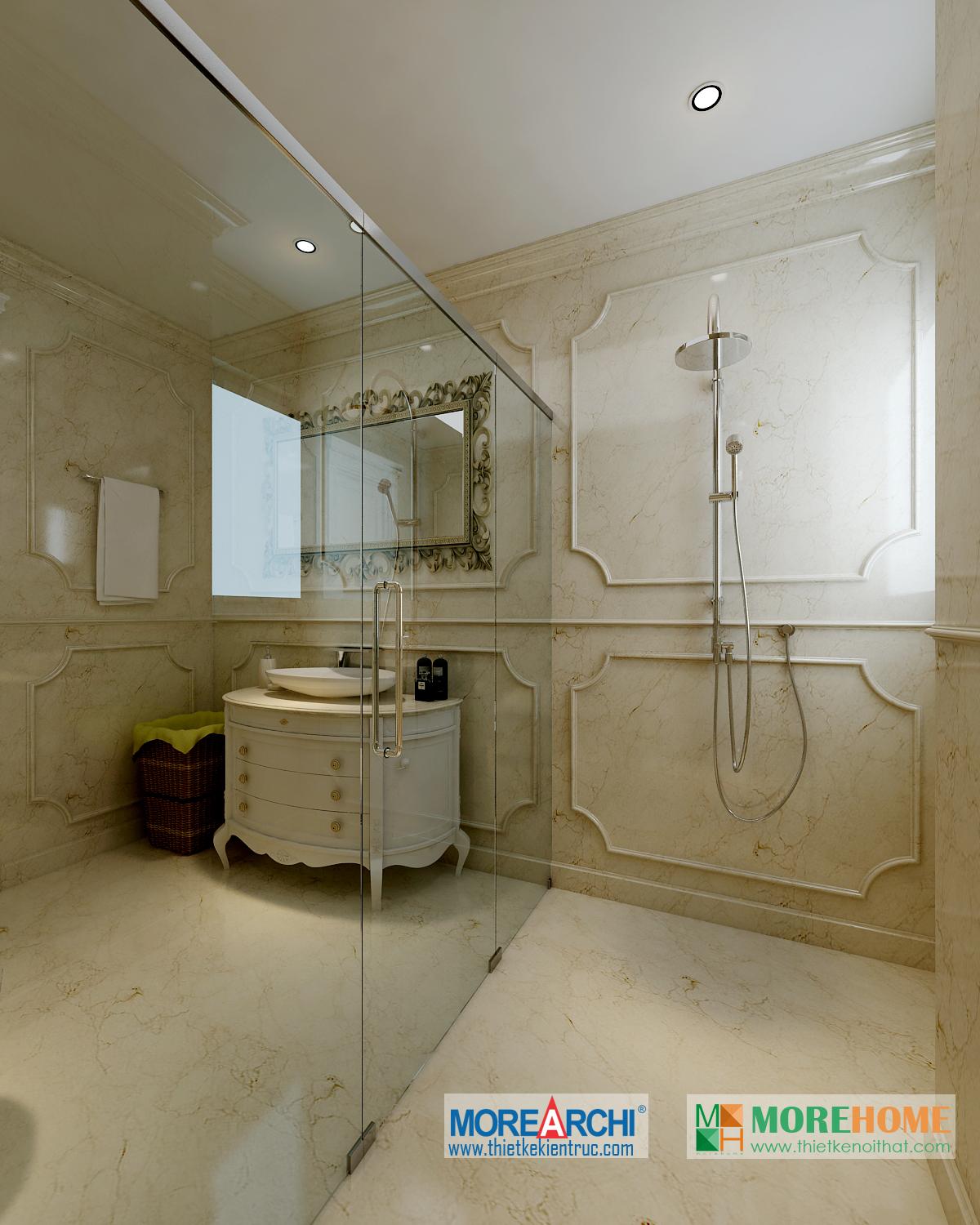 Thiết kế phòng tắm sử dụng các vật liệu nhẹ như kính giúp tăng diện tích sử dụng và tạo độ thoáng cho căn phòng. Không gian phòng được mở rộng và khá nổi bật, kết hợp hài hòa với ánh sáng và màu sắc mang đến cảm giác thoải mái và dễ chịu cho gia chủ.
