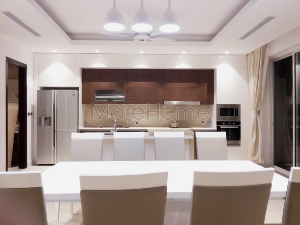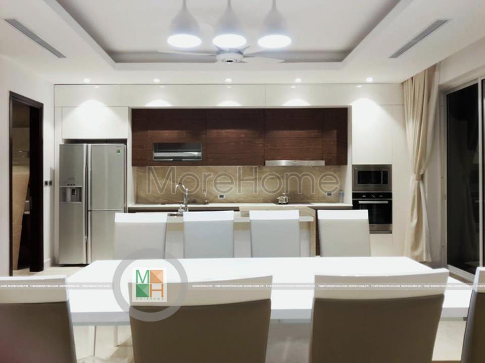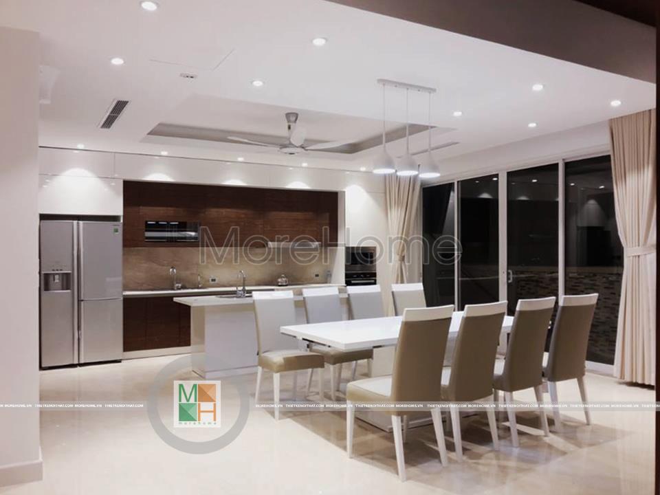 Thiết kế nội thất phòng bếp được liên thông với phòng ăn để không gian trở nên thoáng rộng mà không bị gò bó. Thiết kế tủ bếp âm tường với bề mặt nhẵn mịn gỗ tự nhiên với thiết kế hiện đại cuốn hút mang lại sự tiện lợi cho gia đình trong khi sử dụng nấu nướng.