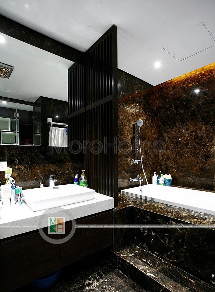 Phòng vệ sinh được thiết kế ấn tượng không kém, với việc lựa chọn đá ốp tường màu tối với những đường nét họa tiết ấn tượng tạo nên một không gian huyền bí mà sạch sẽ. mọi thứ tạo nên một không gian tổng thể vô cùng hoàn hảo.