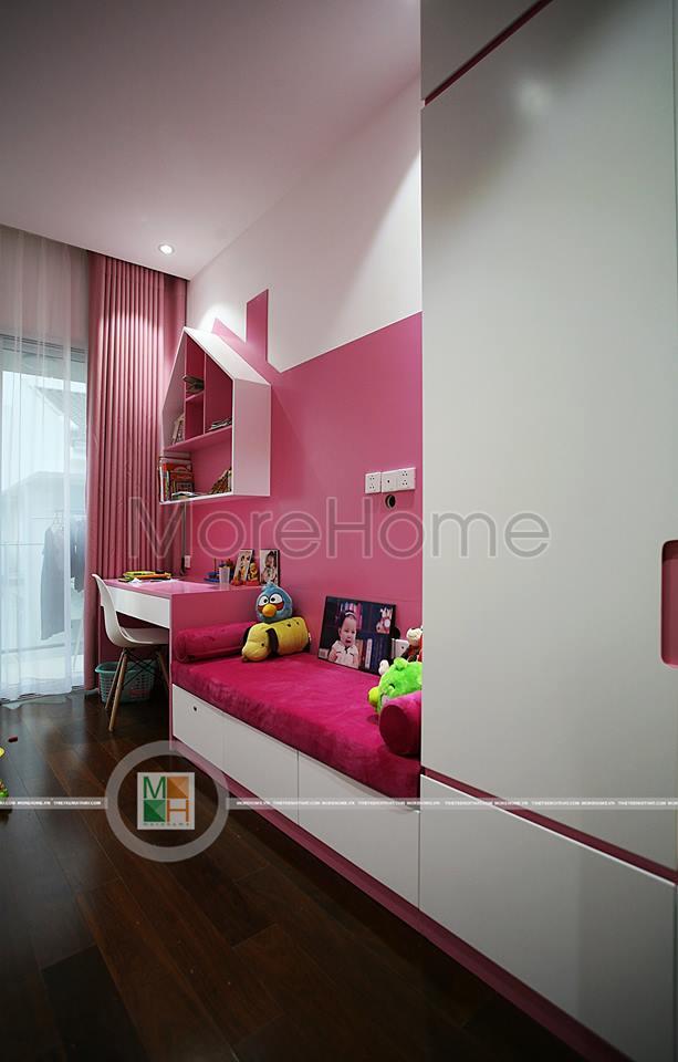 Phòng ngủ cho bé yêu nhà anh Hải cũng được thiết kế vô cùng ấn tượng với gam màu hồng làm tông màu chủ đạo, thể hiện sự đáng yêu, ngây thơ và rất dễ thương. Với một kệ sách và một chiếc bàn nhỏ sẽ giúp bé học tập và sáng tạo một cách đầy đủ nhất. Quả thật là một không gian vô cùng lý tưởng.