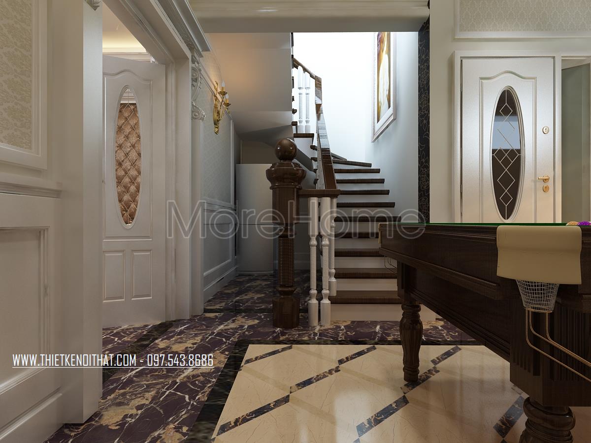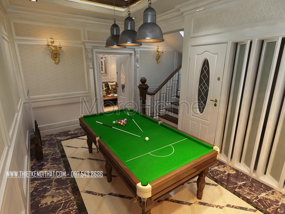 Không gian nghỉ cầu thang thường là nơi khá đơn điệu, không có nhiều điểm nhấn về mặt công năng tuy nhiên với thiết kế này, với việc đặt một bàn bi-a ở đây chính là cách tạo điểm mới lạ, vừa không làm lãng phí diện tích lại giúp tạo một không gian vui chơi, giải trí cho cả gia đình.