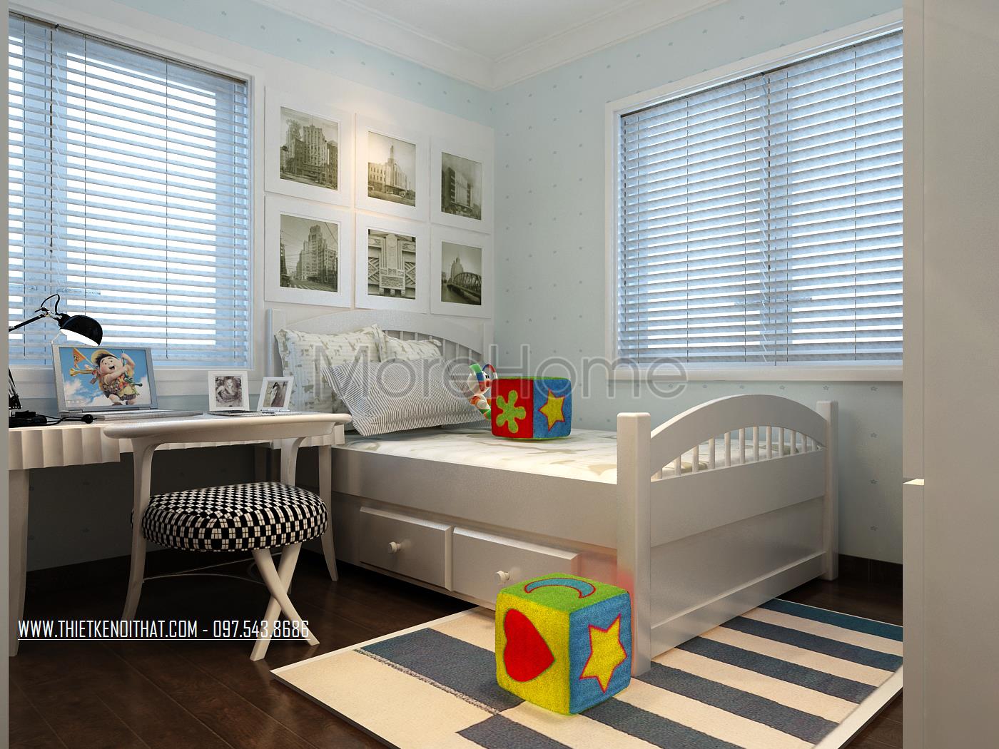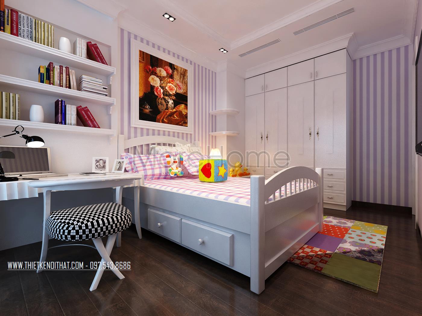 Thiết kế nội thất Vinhomes Riverside phòng ngủ cho trẻ sử dụng tone màu xanh navy điểm xuyết gợi trí tò mò cho gia chủ. Thiết kế giường ngủ kết hợp tủ đựng đồ là một ý tưởng khá hay vừa đảm bảo tiết kiệm diện tích lại tăng tính công năng cho sản phẩm. Hai khung cửa sổ đối xứng giúp mang lại ánh sáng tự nhiên, sức sống cho căn phòng. Ngoài ra, thiết kế tủ kệ chính là điểm nhấn của không gian này, không quá cầu kỳ nhưng đủ để tạo ấn tượng nhờ sự kết hợp khéo léo, sáng tạo.