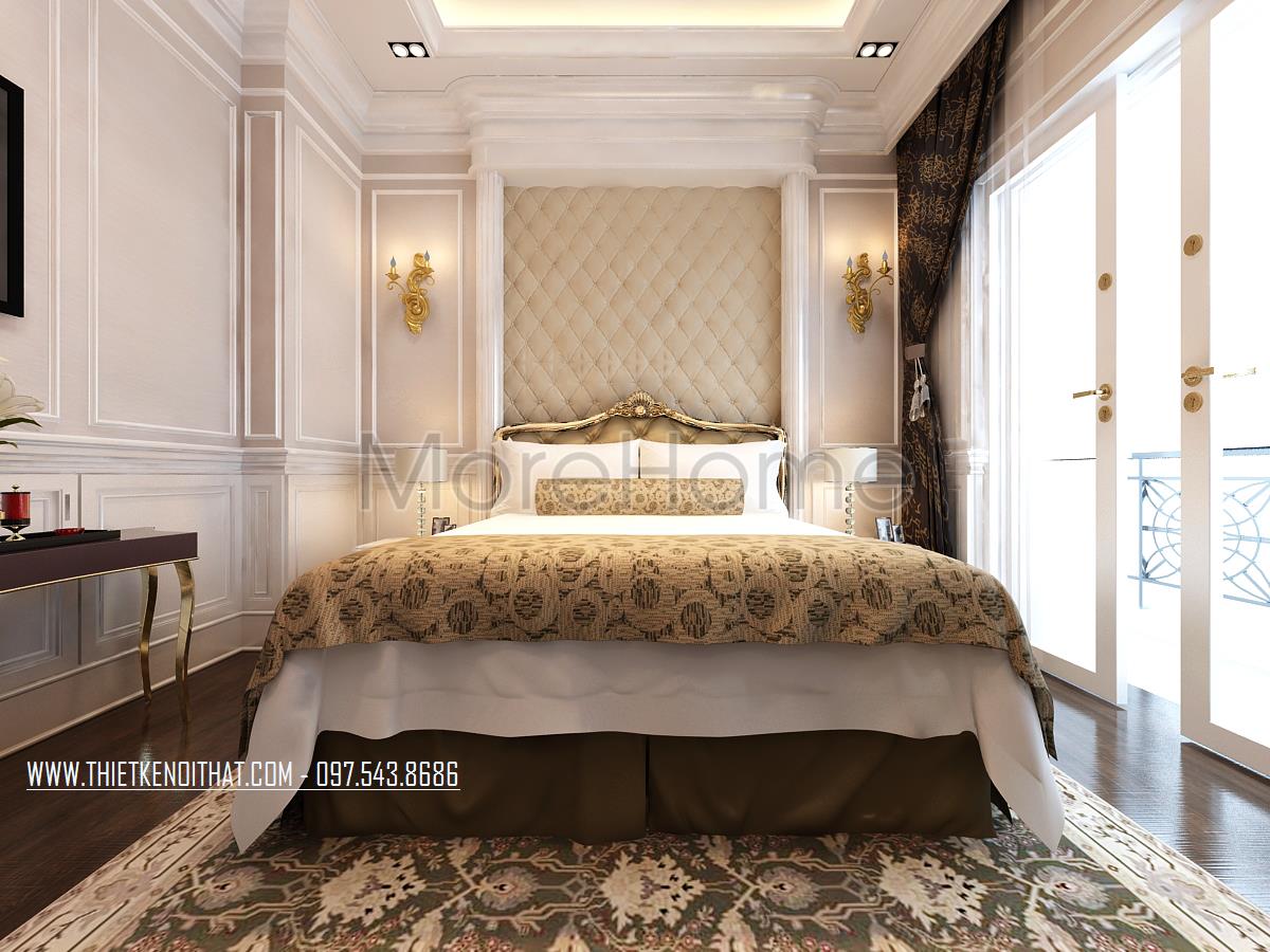 Thiết kế nội thất phòng ngủ sang trọng sử dụng tone màu vàng ánh kim và nâu là chủ đạo. Các thiết kế hoa văn tự nhiên hay mạ kim loại cho các vật dụng như kệ, tủ trong phòng giúp tạo điểm nhấn cho không gian, tăng tính thẩm mỹ và độc đáo cho căn phòng. Không gian hướng ra công giúp mang lại sức sống và sự thoải mái cho gia chủ, thiết kế bốn bức tường bó hẹp không còn mà thay thế vào đó là cảm giác sự gần gũi với thiên nhiên và tự nhiên trong thiết kế. Ngoài ra, hệ thống tủ kệ kết hợp góp phần tăng tính công năng và mang lại sự tiện nghi, ngăn nắp cho gia chủ.