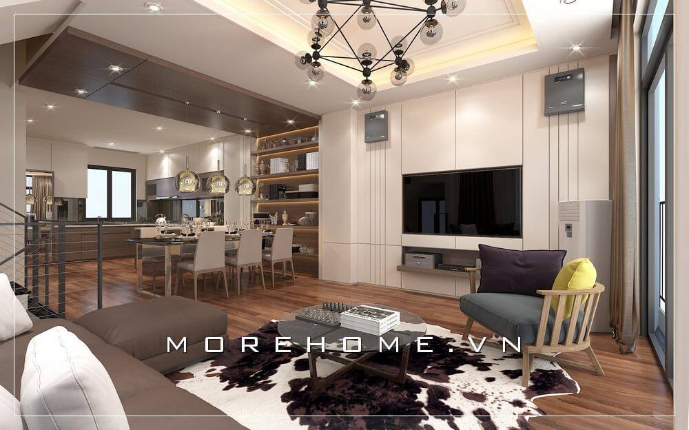 Trang trí nội thất phòng khách liền bếp ăn hiện đại đẹp, sang trọng cho không gian nhà biệt thự