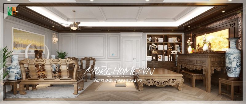 Sàn gỗ được đánh giá cao về khả năng chịu ẩm và nhiệt độ cao, mang đến nét đẹp trang trí cho phòng thờ.