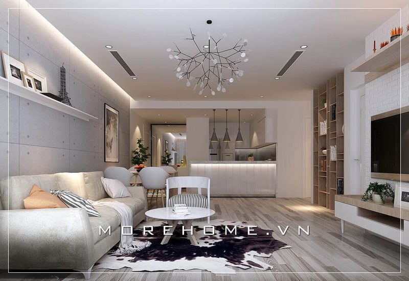 Thiết kế nội thất phòng khách chung cư cao cấp tân cổ điển nhẹ nhàng bằng cách kết hợp sofa màu xám với tone màu sơn trắng tinh tế, tạo ra một cảm giác thanh thoát, nhẹ nhàng.